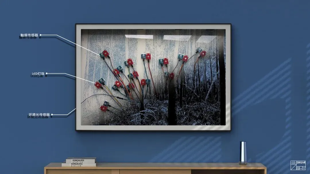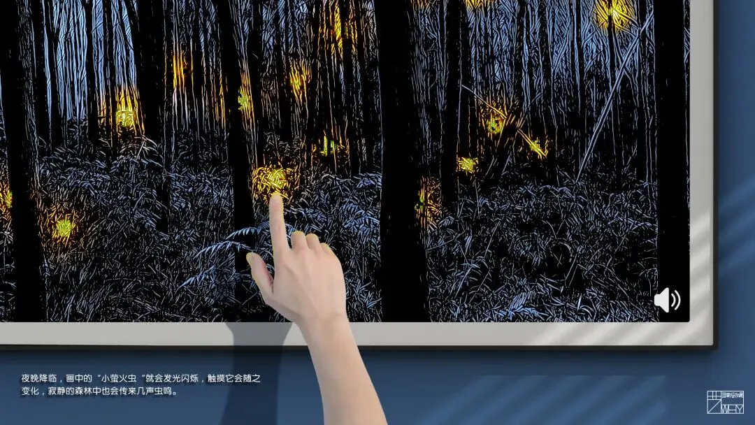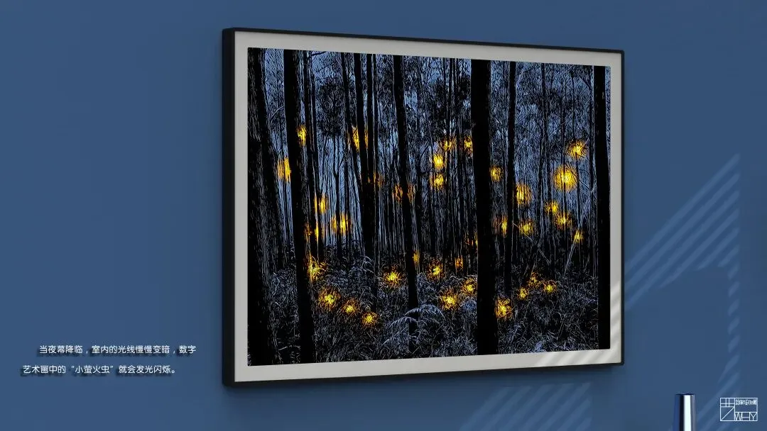 数字艺术的诞生,使得传统绘画艺术在信息时代也可以取得更多的突破,不同于传统艺术,数字艺术产品具有很强的交互特性。当夜晚降临,室内的光线慢慢变暗,数字艺术画中的“小萤火虫”就会发光闪烁,用手触摸它会随之变化,寂静的森林中也会传来几声虫鸣,为你带来视听的双重享受,沉浸其中。从数字艺术的交互方式入手,将数字艺术和交互产品进行结合,打破了人们对传统艺术的认知,给人以全新的视觉感官交互体验。