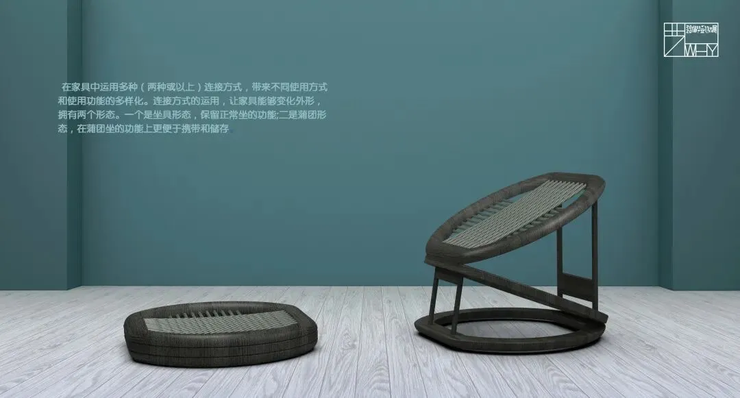 在家具中运用多种(两种或以上)连接方式,带来不同使用方式和使用功能的多样化。连接方式的运用,让家具能够变化外形,拥有两个形态。一个是坐具形态,保留正常坐的功能;二是蒲团形态,在蒲团坐的功能上更便于携带和储存。