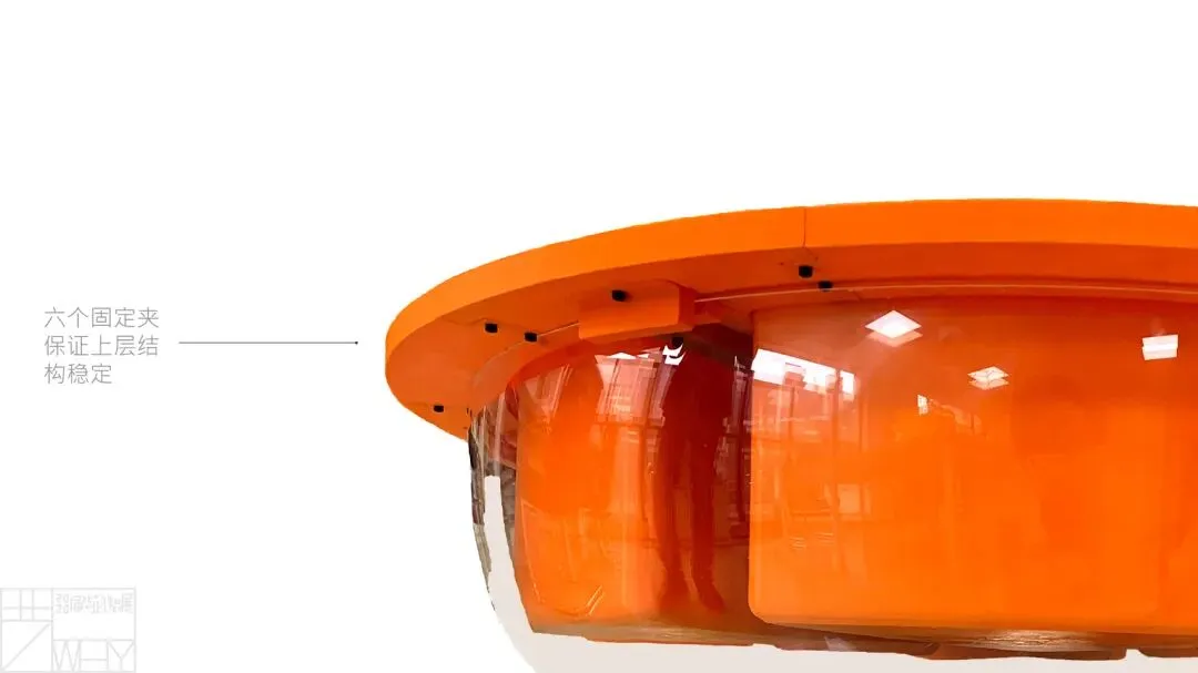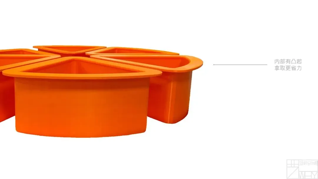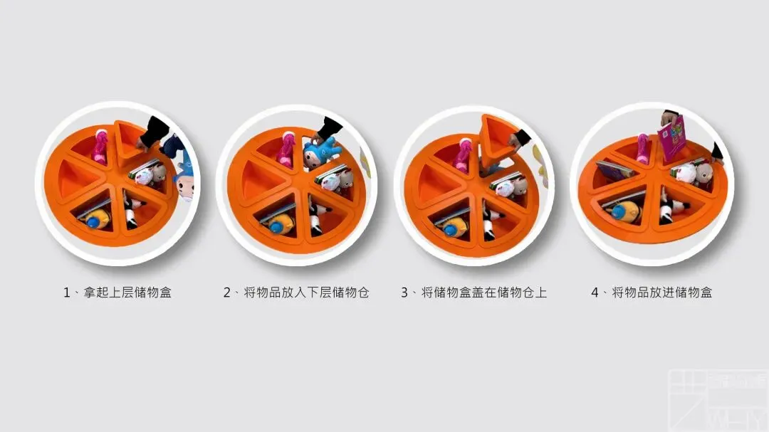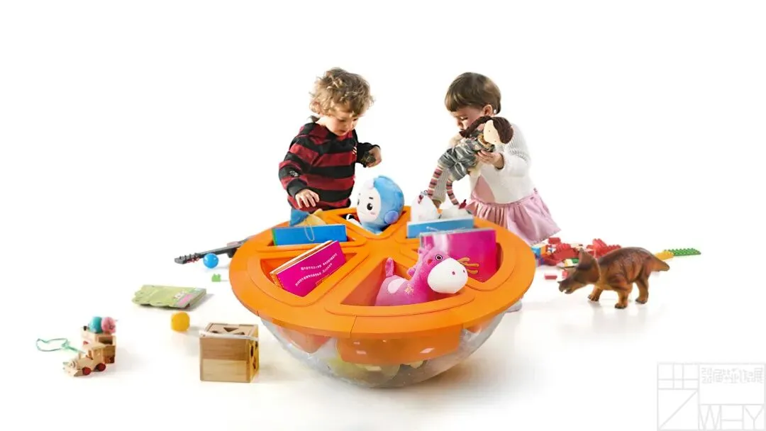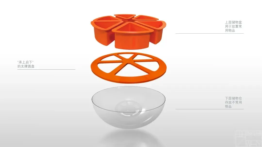 这是一款兼顾功能收纳与趣味互动的儿童储物产品,用来在玩乐中培养孩子的收纳习惯。该产品形如半个橘子,半球形的底面,使孩子很容易发生与产品的玩耍互动行为。利用橘子天然的果实结构,有效分隔出数个独立的储物仓。每个储物仓都易于单独取出,形成上下储物空间的有效联通。