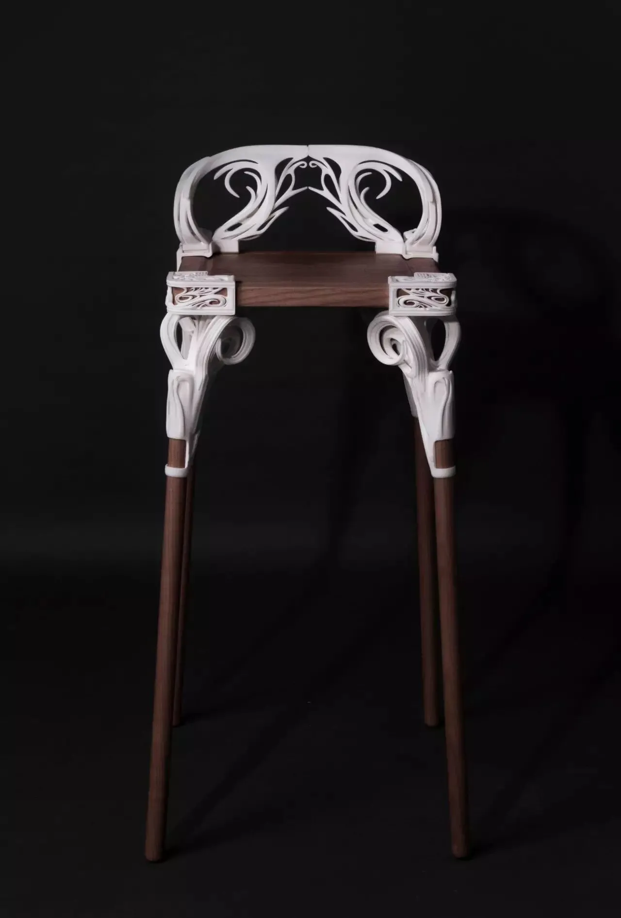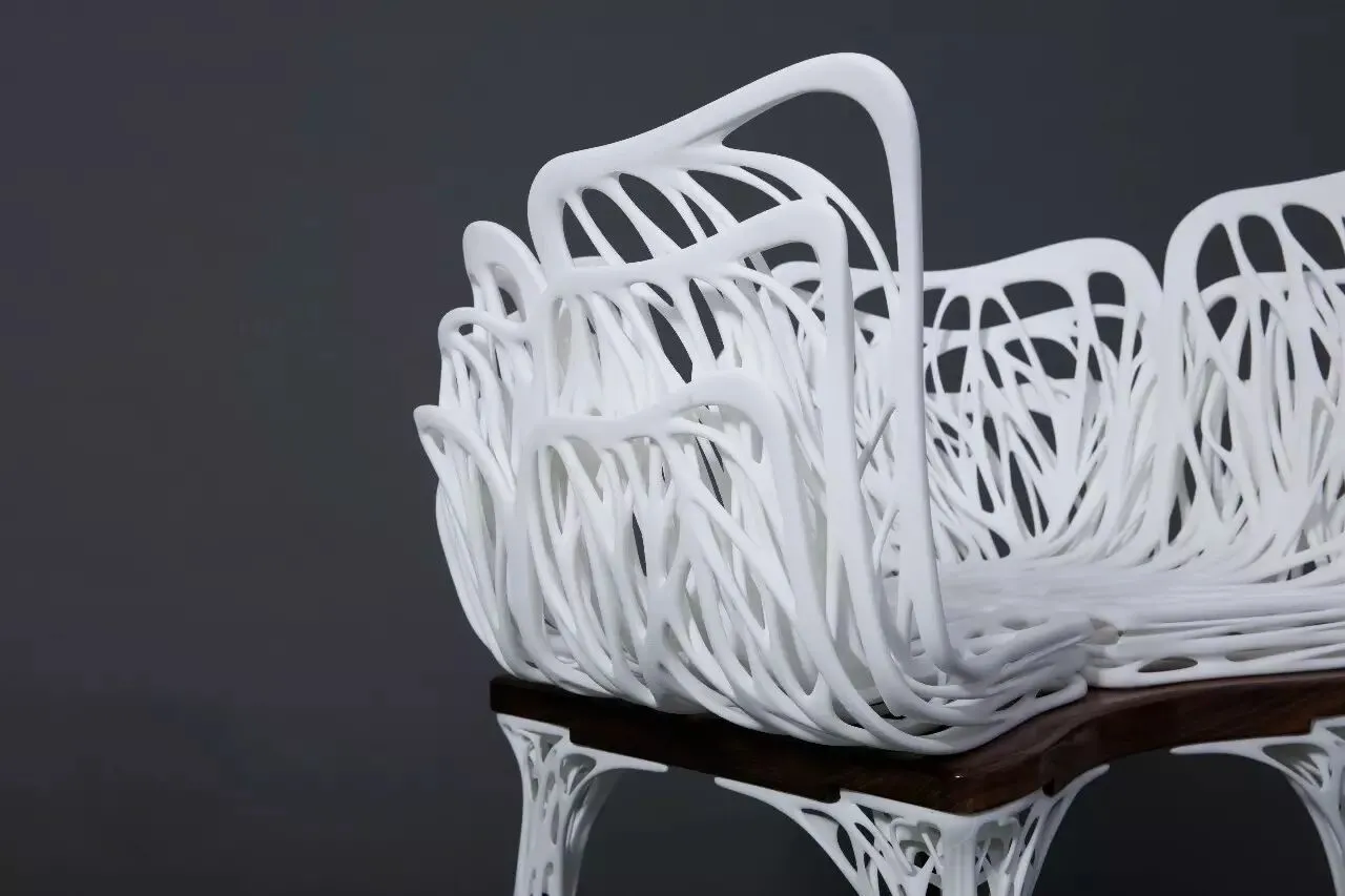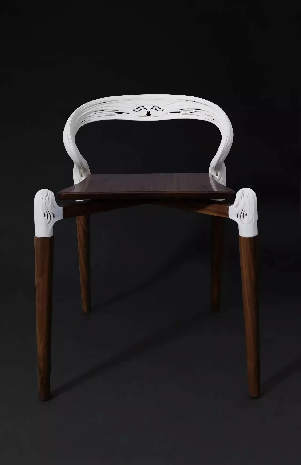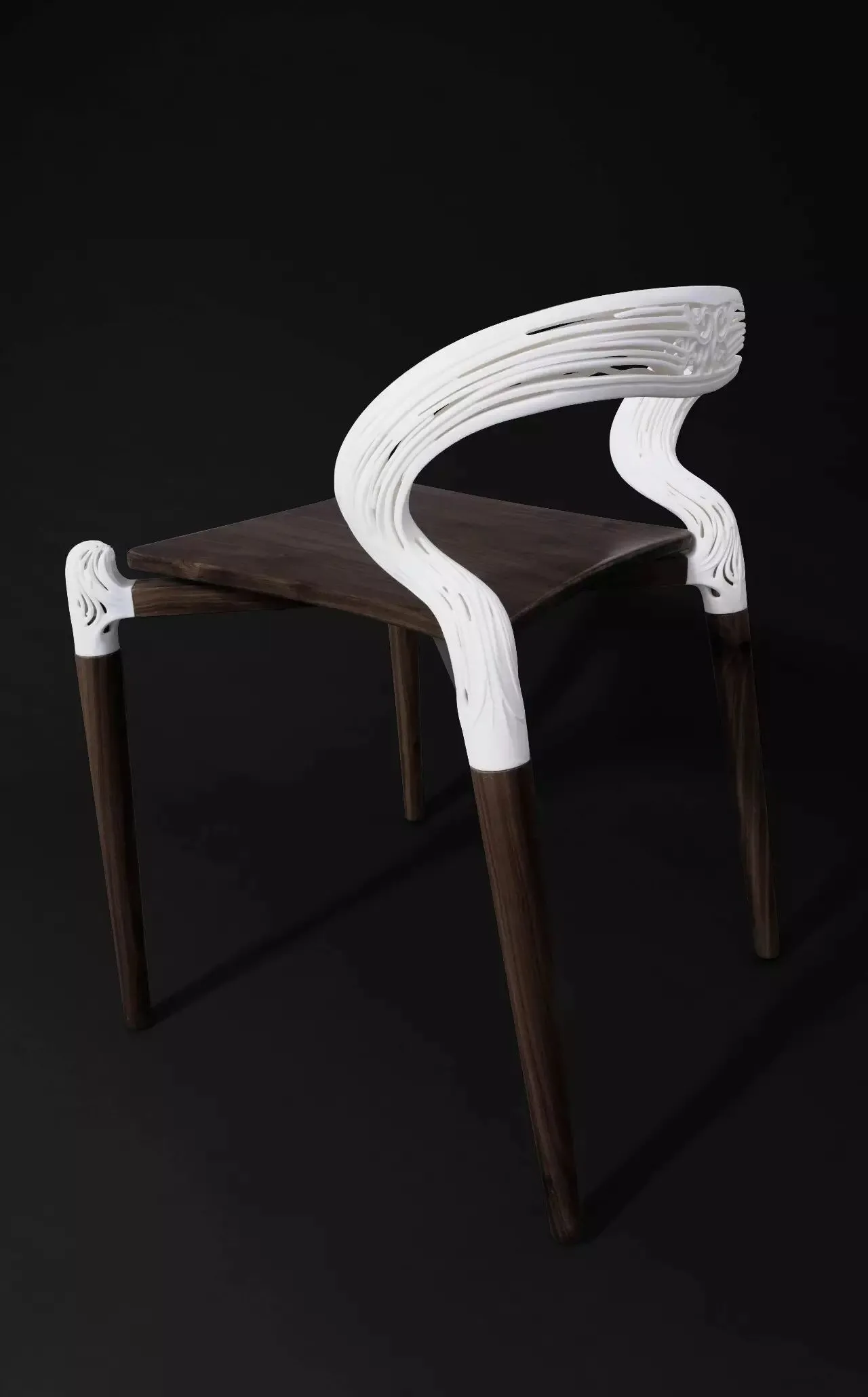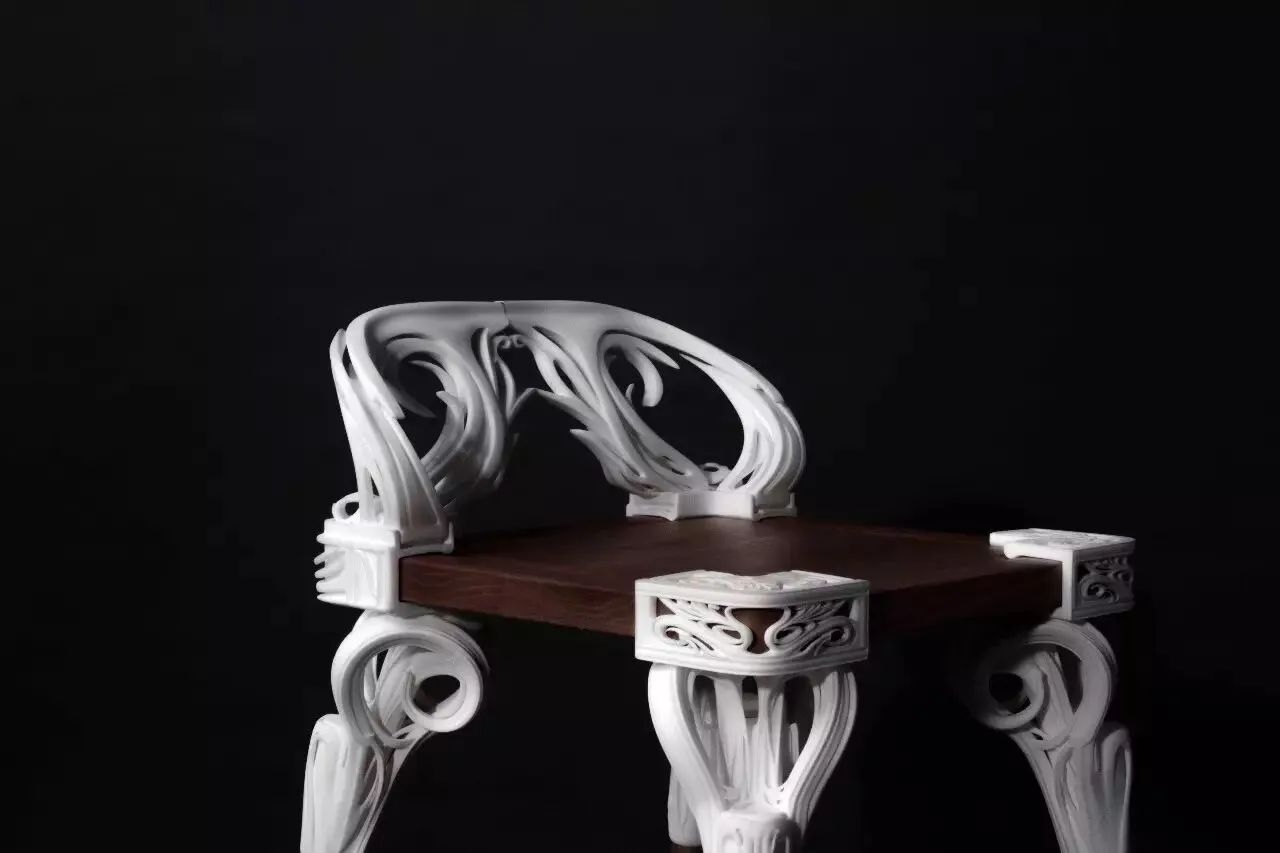 充分利用3D打印技术可快速成型的特性,建造手工无法制造的复杂外观和结构;替代传统实木家具中加工难度大,损耗高的隼牟结构。把生于自然的木材色彩,纹理和电脑建模的构件造型相结合,设计出传统工艺无法制造的工艺椅子。