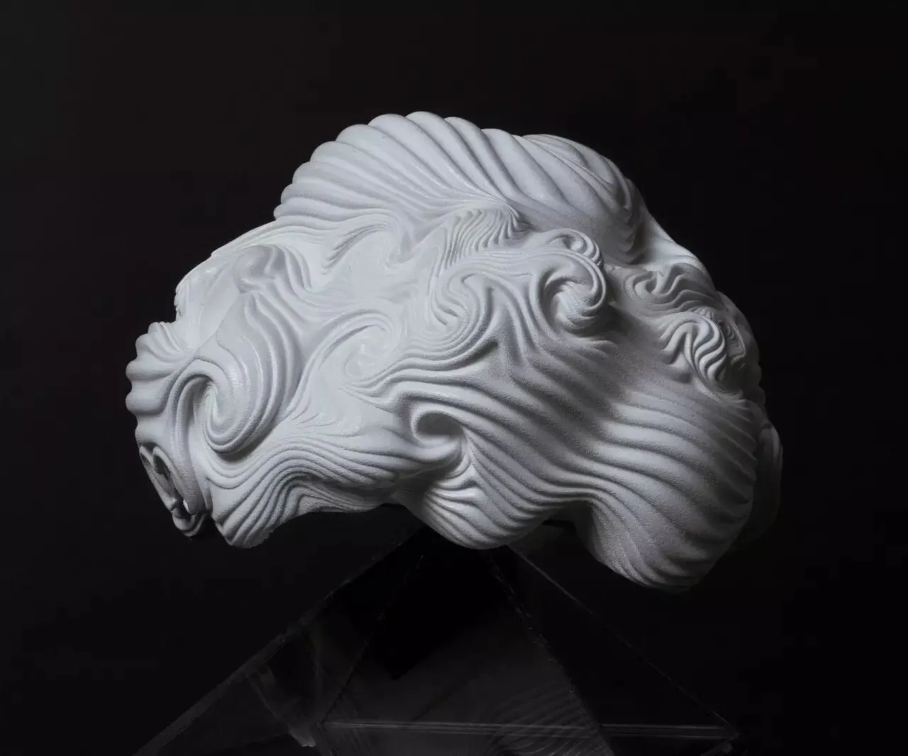 作品的设计理念是基于稳定性、力学以及比例等美学要素,让三维设计的表现形式融入到家具设计中,通过3D打印与木头结合的方式带给家具新的尝试,呈现不一样的视觉观感。3D打印部分通过三维软件设计整体的曲线形态及局部表皮,然后整体打印; 木头部分则保持原有木色纹理。三维设计的灵感来源于流水侵蚀塑造的地表形态。