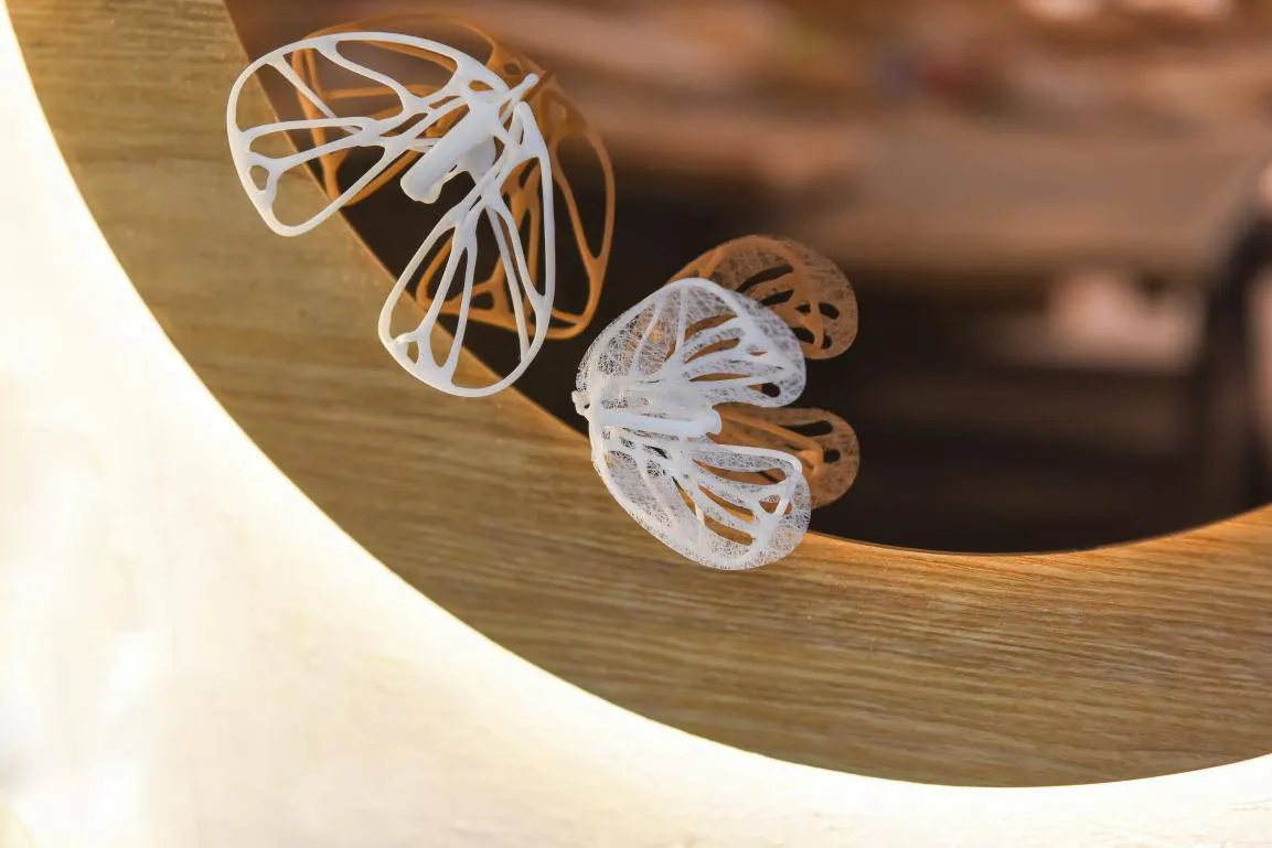 作品的设计灵感源自蝴蝶,运用3D语言对新艺术运动中的师法自然和曲线美风格进行再设计,赋予它新的灵魂。借用3D打印的优势,用富有张力而不失韵律的线条去塑造一只破茧后重获新生的蝴蝶。
