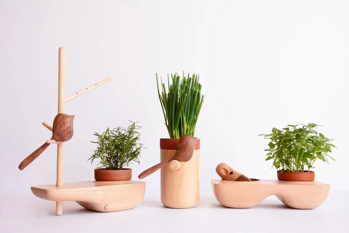 把一些种植的行为或是蔬菜加工处理的方法通过设计融入到产品中去,使之成为一种有趣的生活体验。这组家居产品设计运用了鸟的元素作为收割或是加工可食用植物的小工具,以组合的形式呈现种植调味蔬菜的小产品。