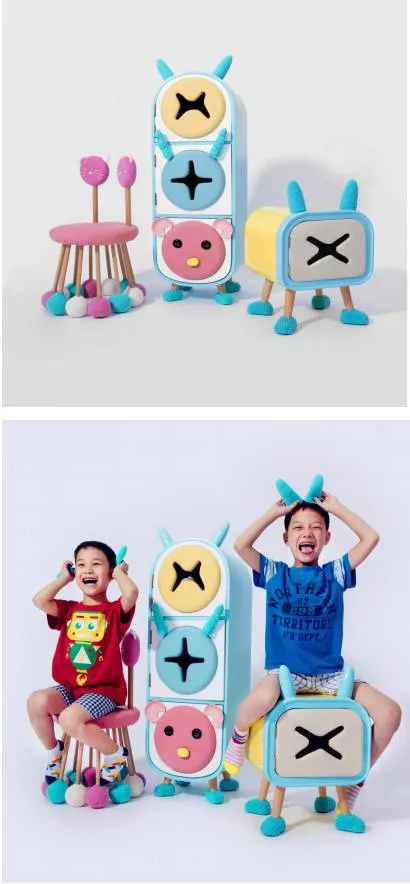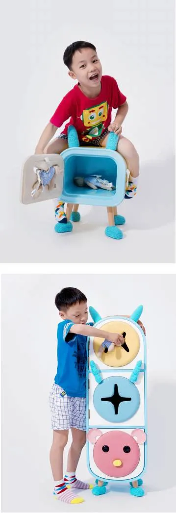 “乐·掏”,开心快乐地掏东西。爱玩耍是孩子们的天性,孩子天生对事物好奇,让儿童家具与玩具相结合。通过柜子以“掏”的方式进行藏,取东西,满足孩子们天生的好奇心。卡通造型让孩子们更具亲和力,舒适温和多彩的色调搭配更能造就孩子活泼,乐观,愉悦的本真心灵。材料使用了白蜡木,针织,软包,让这套趣味性儿童家具家具更有安全性。