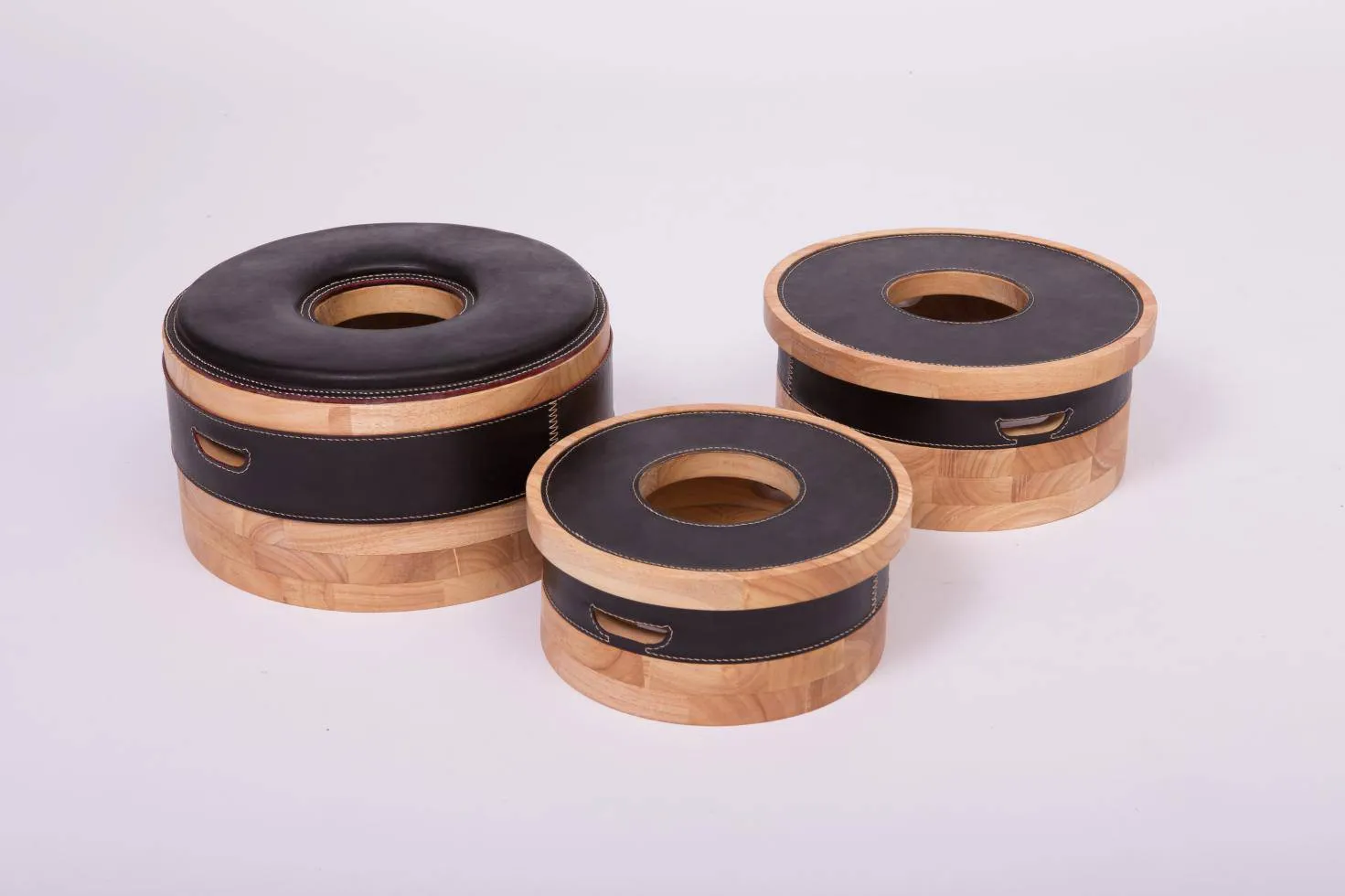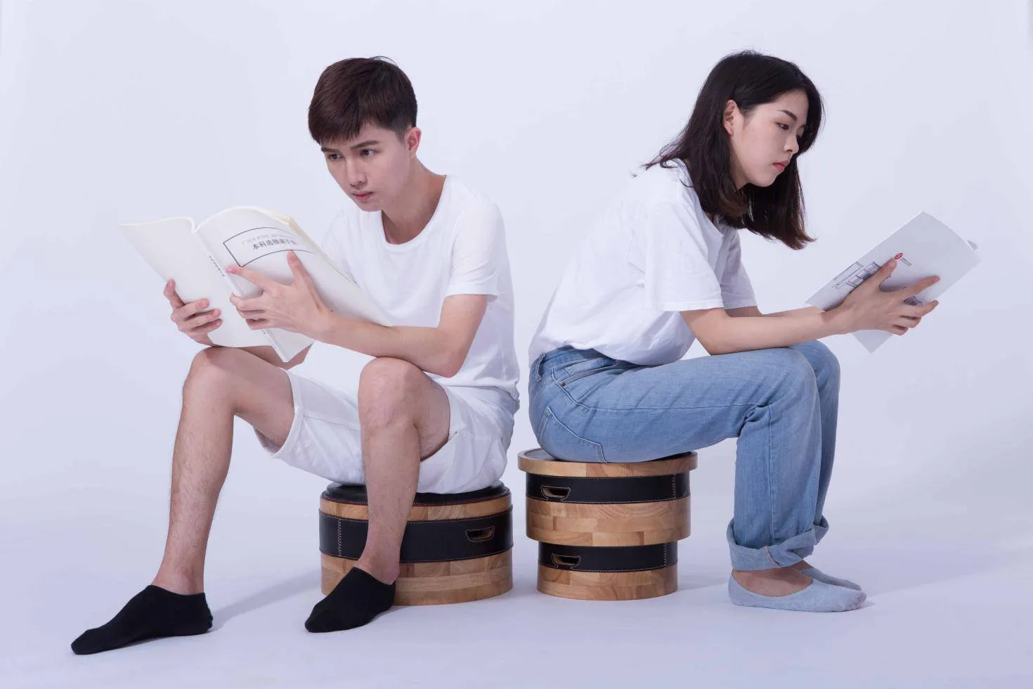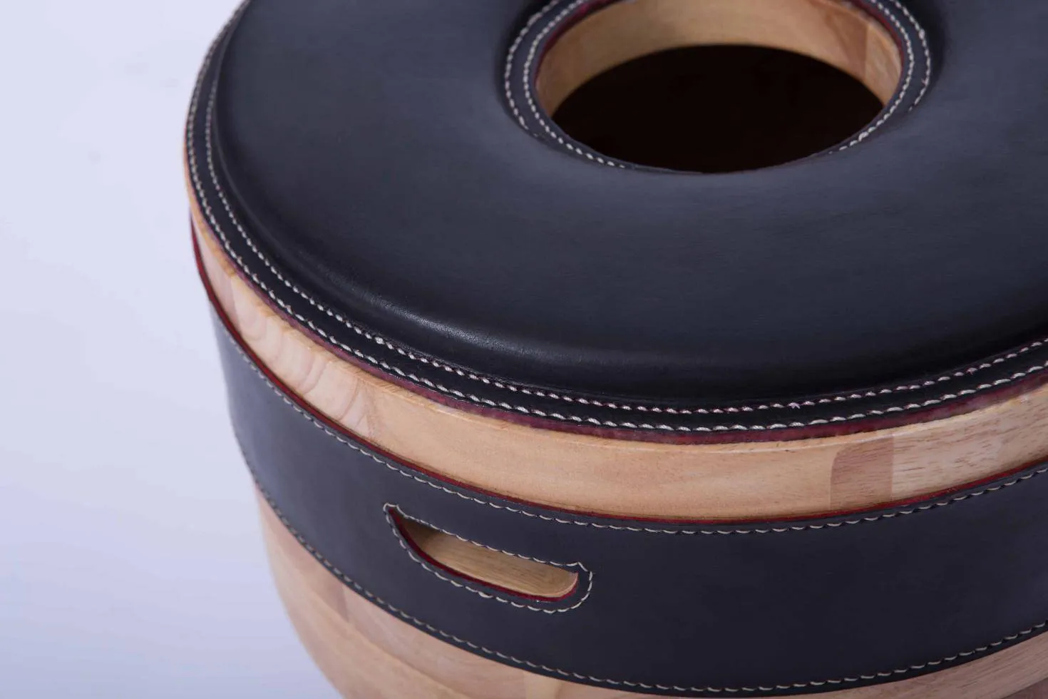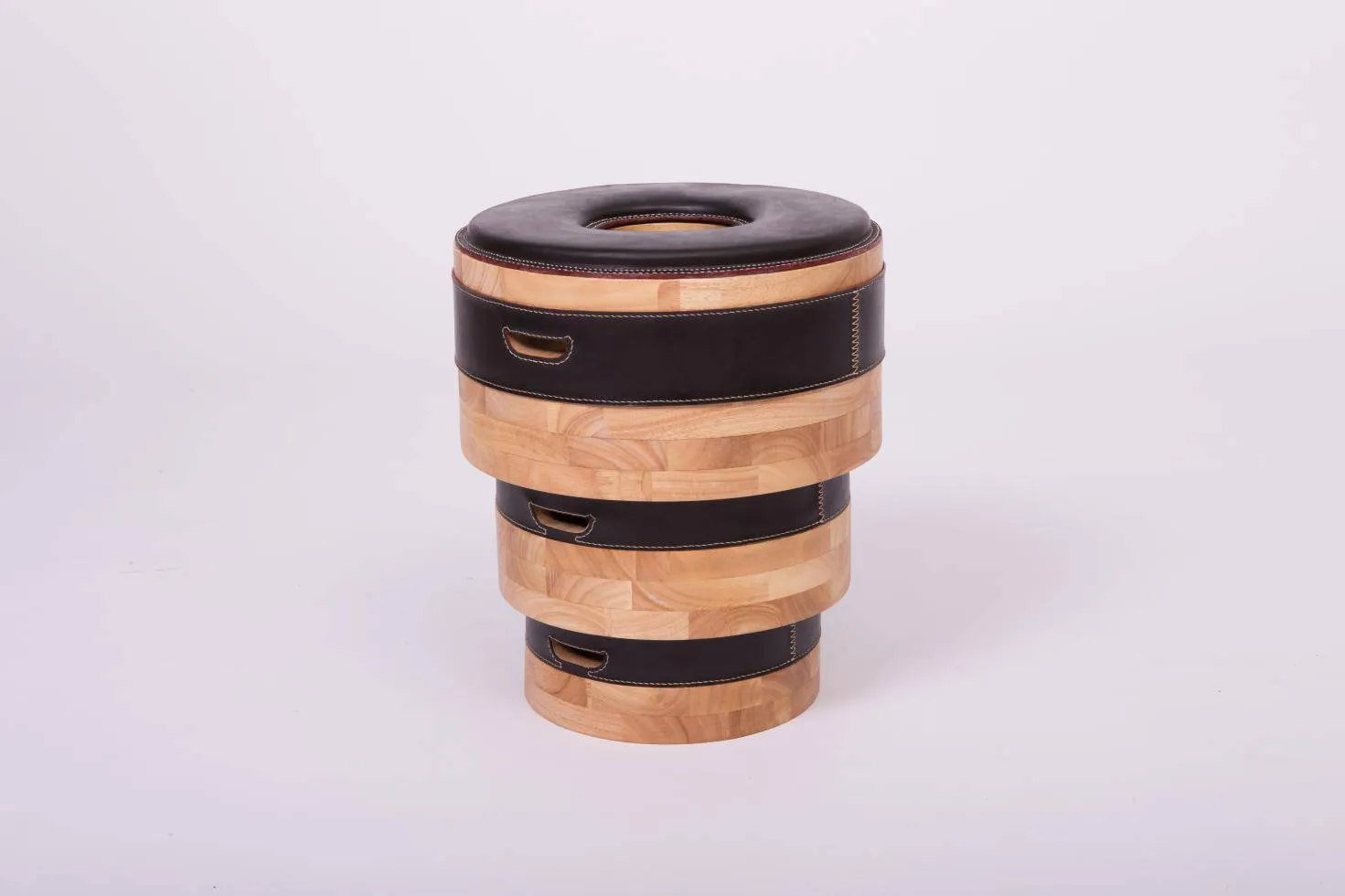 螺套的“123”是一只可由“一变三”又可由“三变一”的可自由组合玩味的螺套开合凳,可以根据自身在不同场景需要自由变换不同高度,由橡木和植鞣革材料搭配,木头制作工艺流程简易,皮具制作精致,整体典雅有趣