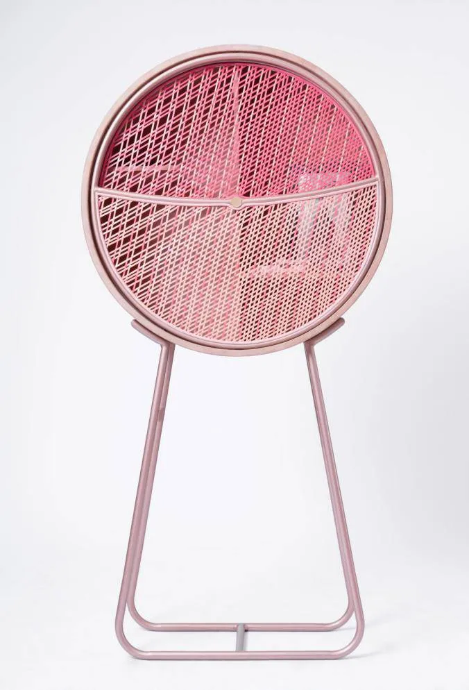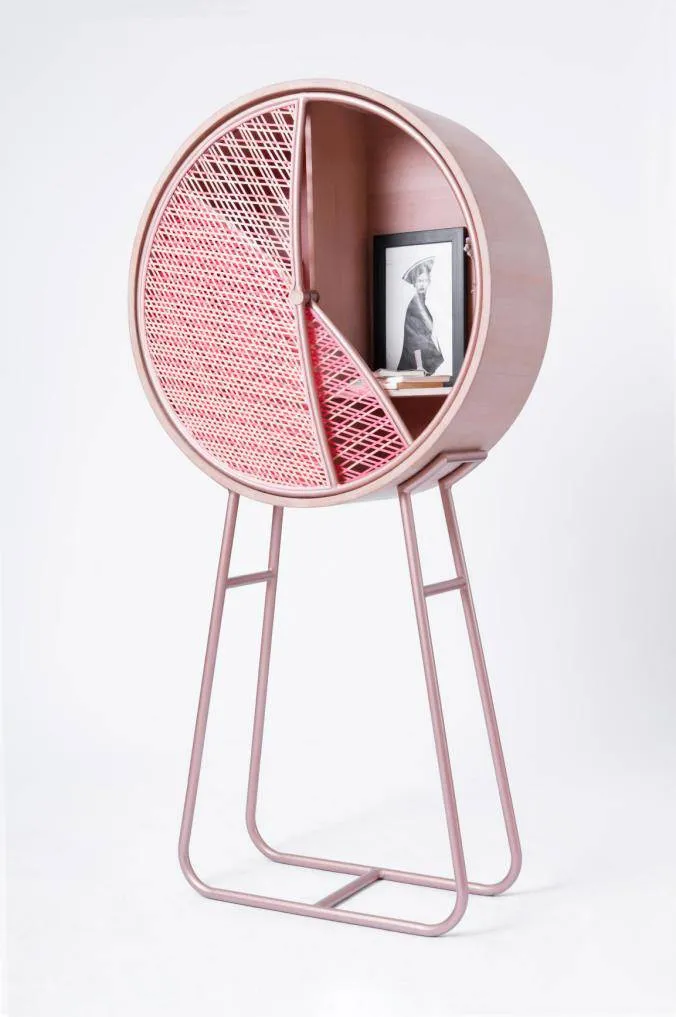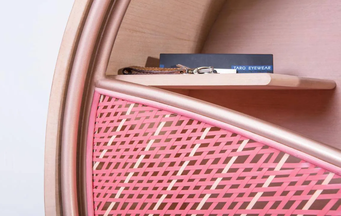 “动”与“静”是”半遮”圆柜设计的要点。两扇半月形的,由藤编构成渐变效果的旋转门,在动时产生变幻的叠影;在定格时则生成出不同的构成图形,把柜子划分为开放、半开放以及全遮蔽的储物空间,并隐约透出柜内陈列的物品,呈现出静观美。