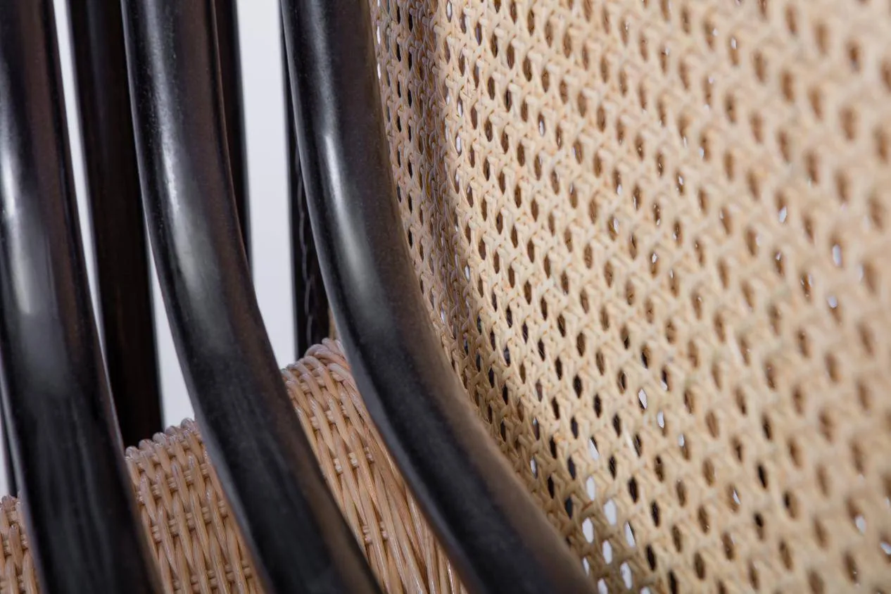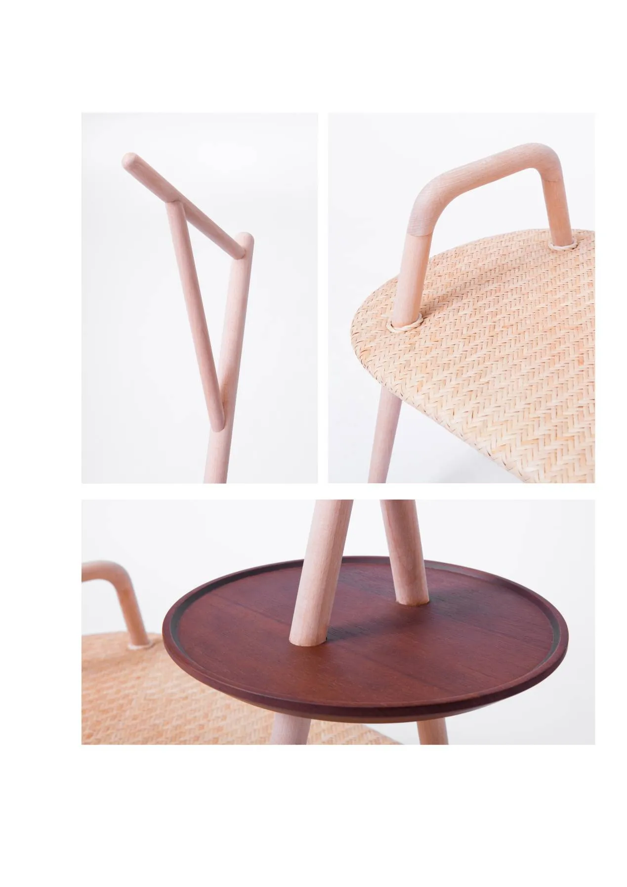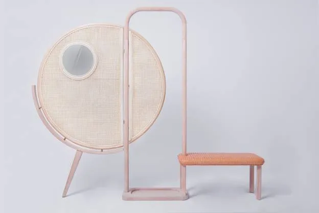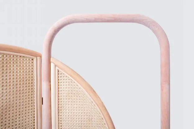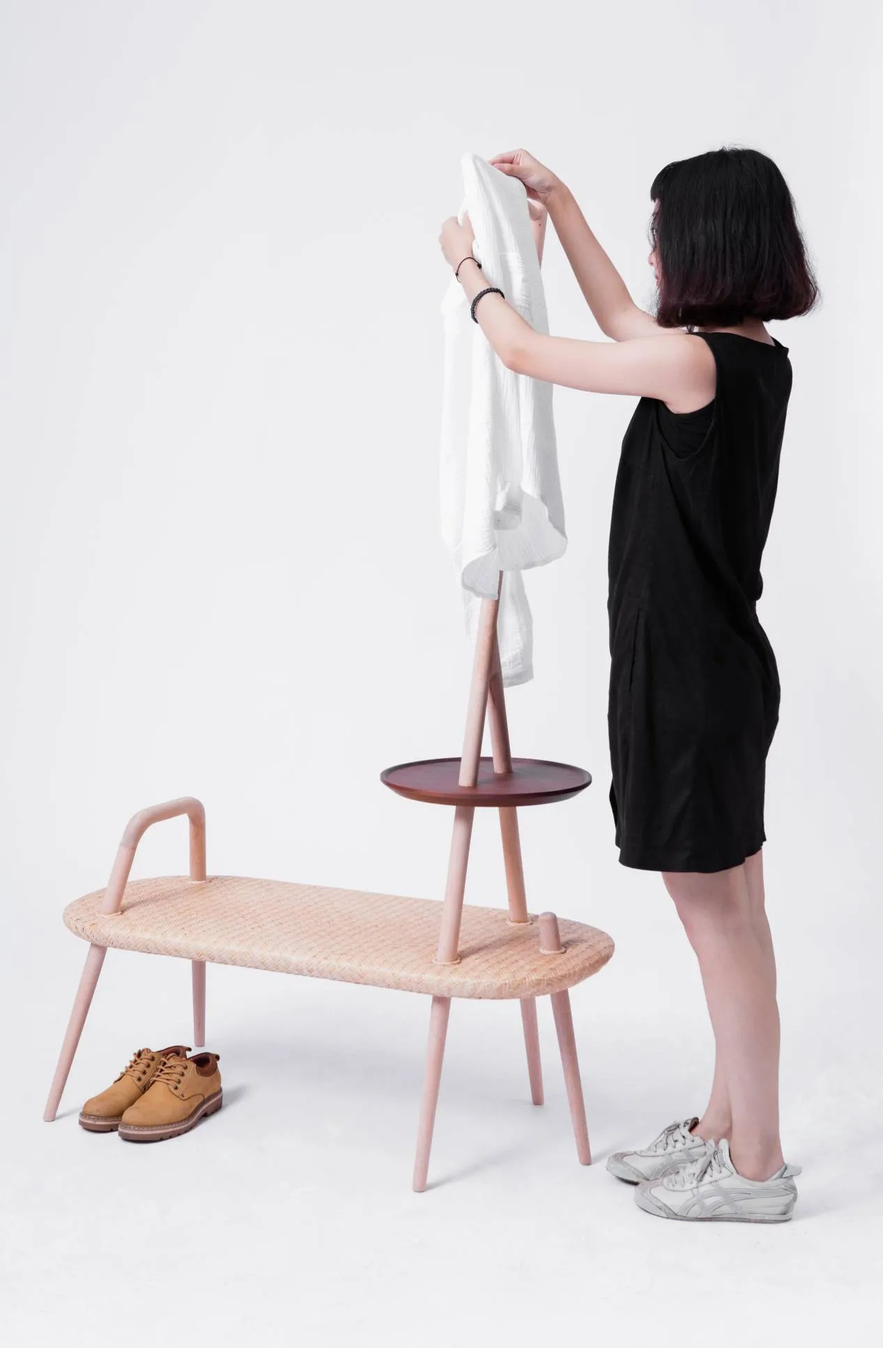 一扇屏障,鄣开喧嚣尘俗,归于本真。中国画中纨扇与山水元素的提取,以线成就方圆,重构出“一鄣”屏风,并融入了衣帽架、化妆镜及座凳的功能,使其更加满足休憩空间中人们的使用需求。藤与木交织共生,令用者能触摸感受到传统藤艺手工的温暖,感受生活的恬静与喜悦。