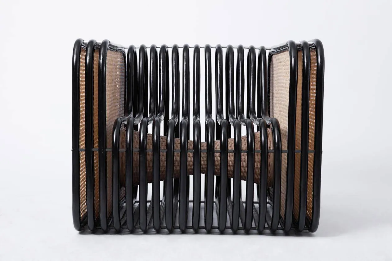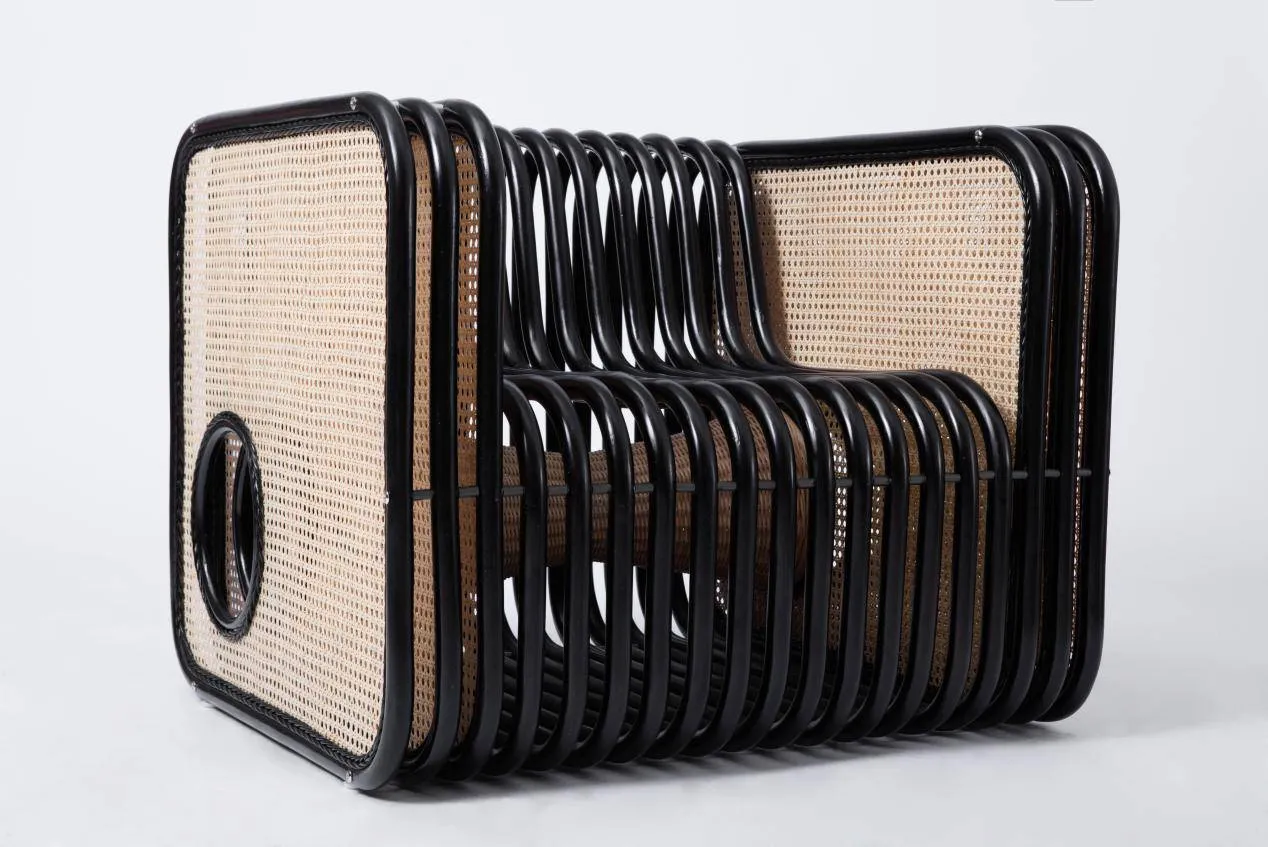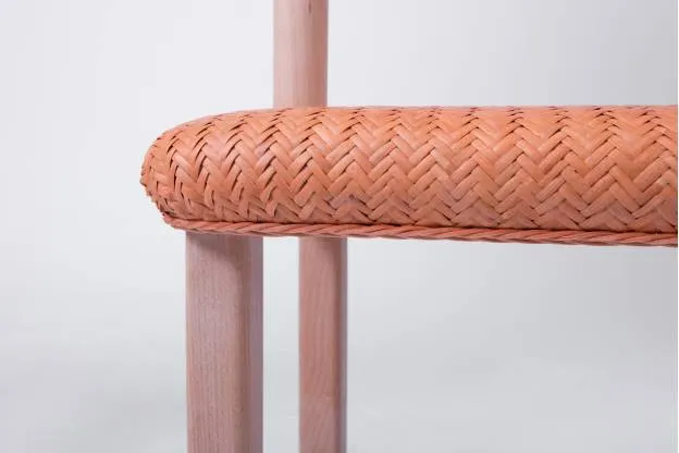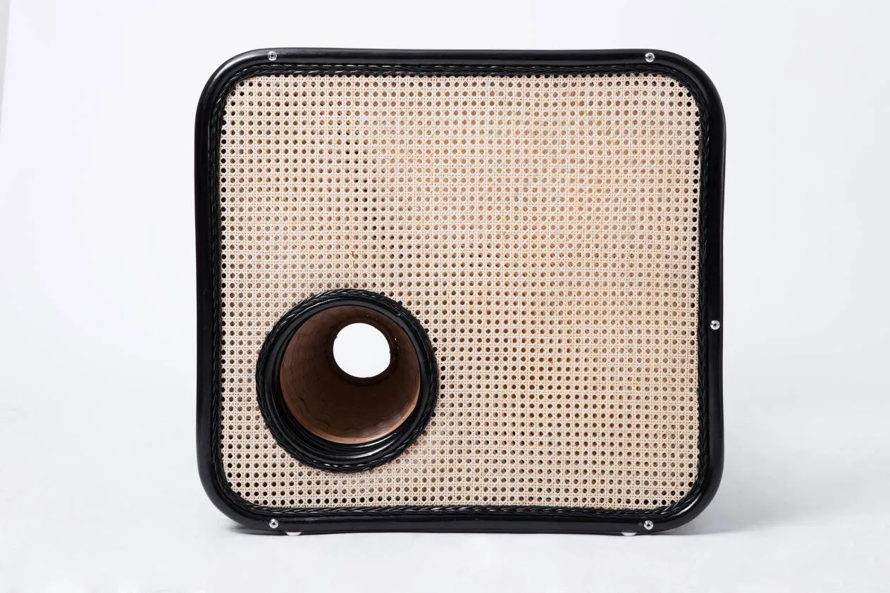 “Qu”既能读“qū”,同“曲”,一是字面上的意思,通过原藤的弯曲来组成整个椅子的形态,二是整个椅子的造型与“曲”相似。“Qu”也能读“qù”,同“趣”,指人与宠物之间互动的乐趣。整个椅子都是利用藤为“线”的特点来进行设计。