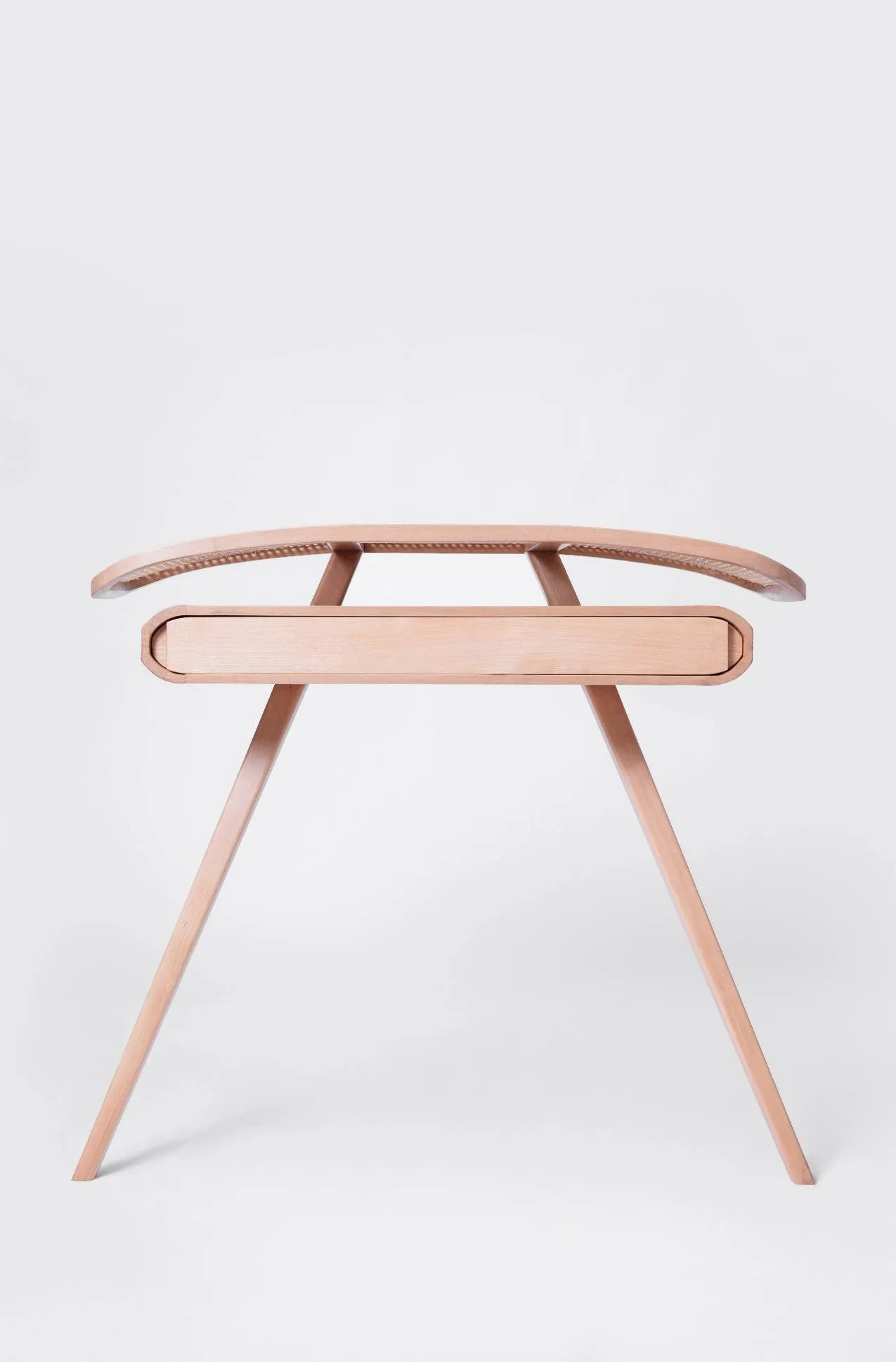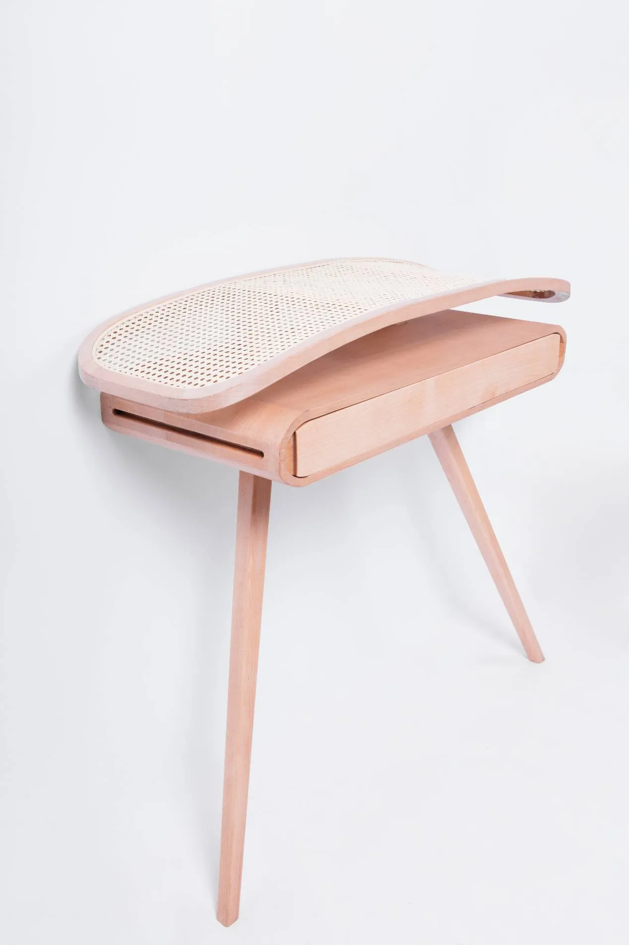 “叠案”受传统家具的启发,从“条案”中提炼关键的形态要素进行简化和再设计,以藤、木为材料重新演绎。腾空的叠层,通透的藤编案面,独特结构的抽屉,现代简洁的腿部,家具依墙而立的平衡感,是本设计的亮点,“叠案”在承担边桌用途的同时,也成为家居环境的装饰品。