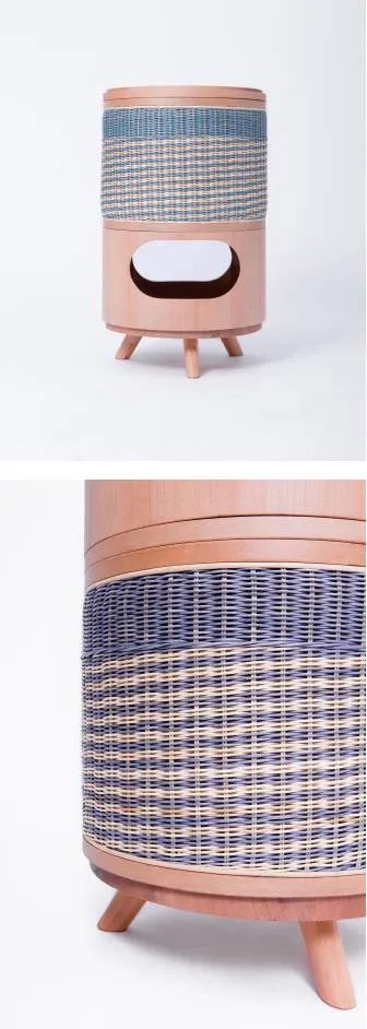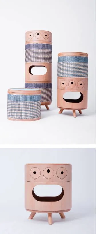 “任•意”的设计特点在于模块化、多功能和趣味性,作品用藤木材质结合制作,由7个单元模块构成。用户可根据需求而搭配组合,不同的撘配使模块之间转换功能(收纳盒、茶几、凳子、花架),拟人化的(表情)造型趣味十足。
