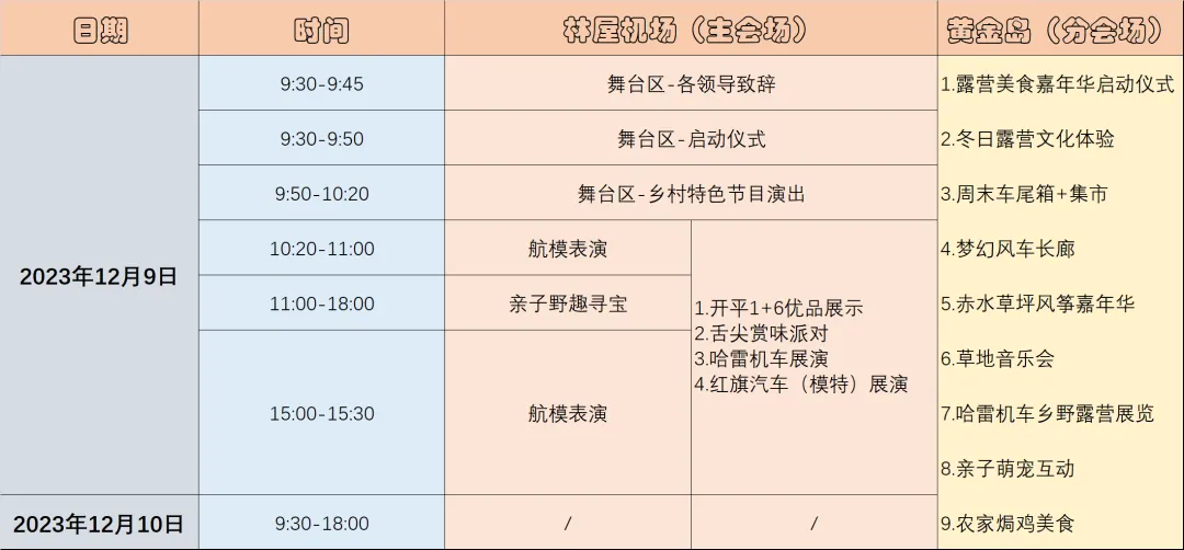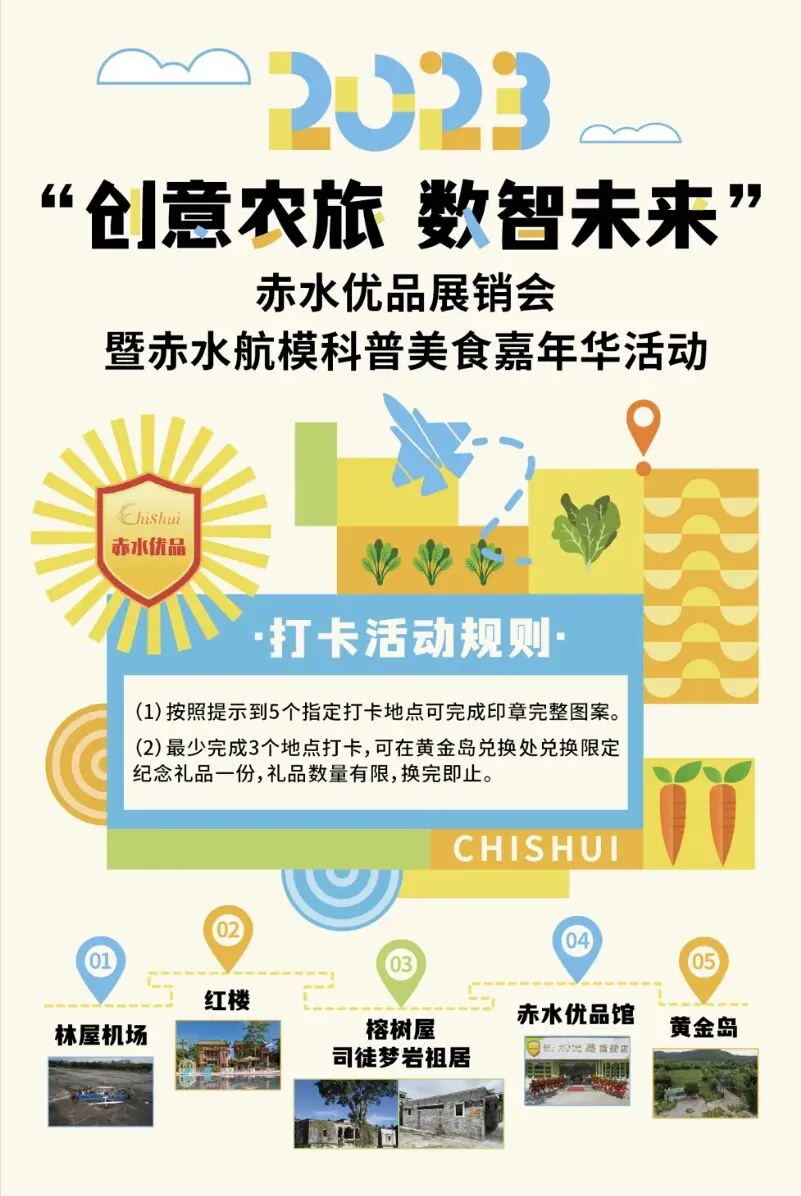 赤水优品展销会暨赤水航模科普美食嘉年华活动将分林屋机场、黄金岛等2个会场进行,2个会场均免费进场,包括赤水优品展销、航模表演、露营美食嘉年华、周末车尾箱+集市、草坪风筝嘉年华、草地音乐会、农家焗鸡美食等多个不同类型活动,为开平市民及游客带来一场集“吃喝玩乐”为一体的旅游盛会。