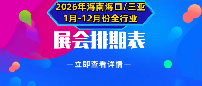 展会排期网-zhxxpq.com花费大量人力物力,坚持为大家整理编辑各地展会排期表,只因为我们知道这是您想要的信息,我们坚持做一个有内容、有价值的网络服务平台。据不完全统计,2026年1月-12月份海南海口全行业已知大小规模展会活动有近30场+...... 2026年全国即将有众多大牌展会悉数登场,行业涵盖了餐饮、大健康、家博会、清洁用品、烘焙、保健、跨境电商、食品、食品设备、纺织、酒店用品、跨境电商、半导体、五金、铁路轨道、汽车、化妆品、服装、机床、清洁用品、珠宝、宠物、家居、茶博会、农机、美容美妆展等多个领域。哪些精彩展会值得您重点关注和参与?敬请持续留意我们后续发布的详细展会信息排期预报哦!