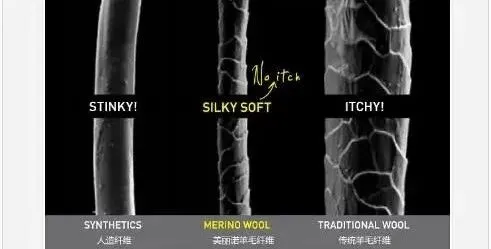放大看美利奴羊毛与普通羊毛的纤维对比:美利奴羊毛纤细、光滑,细腻媲美羊绒,美利奴羊毛细度是16.5μm;羊绒细度:是15.5μm,非常接近。