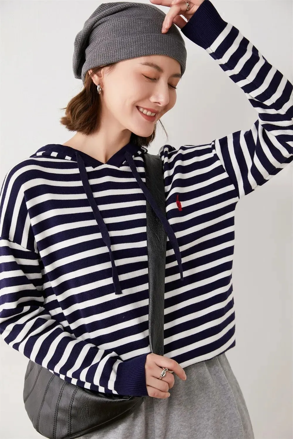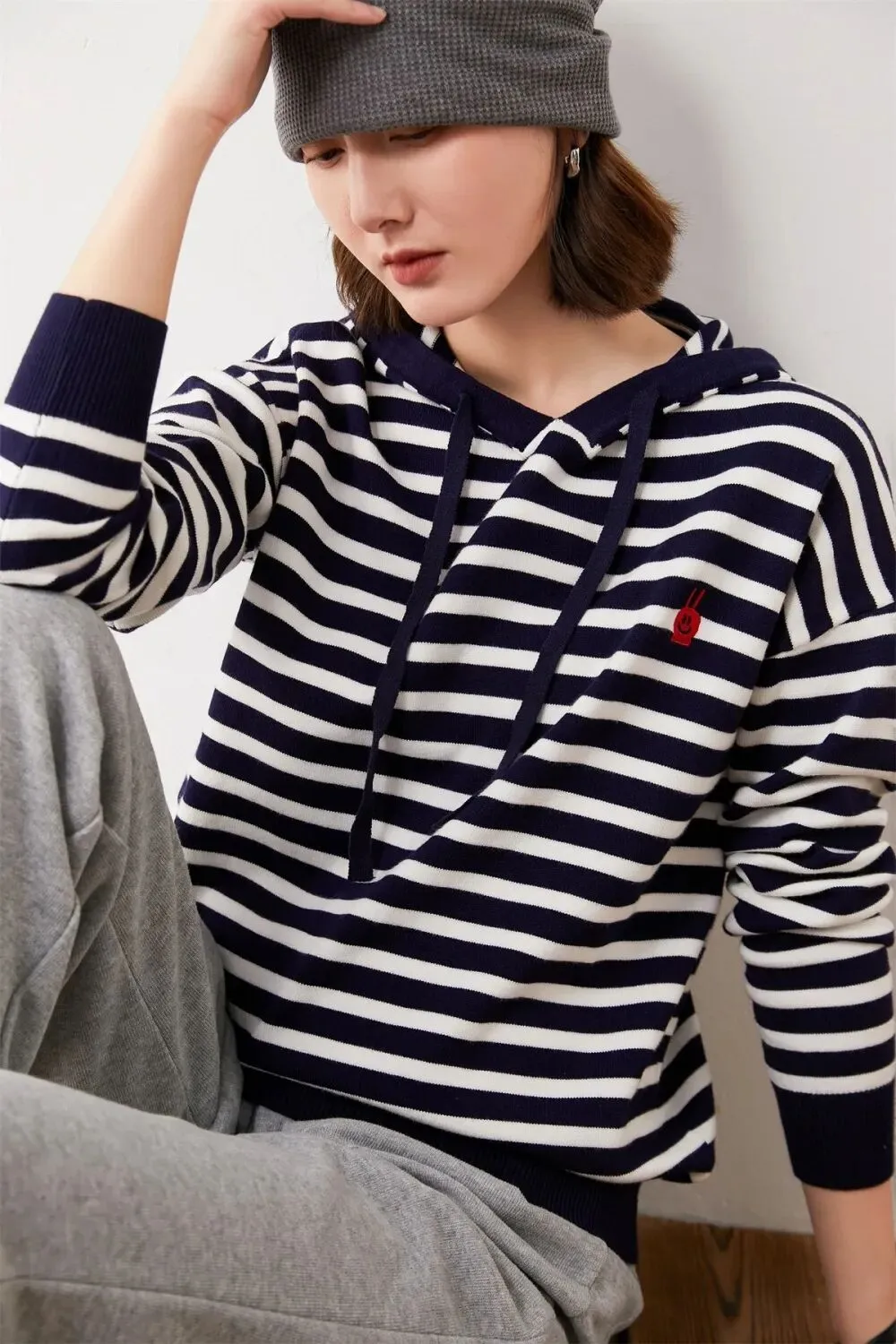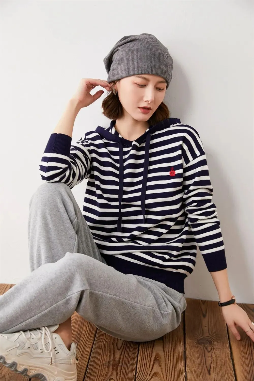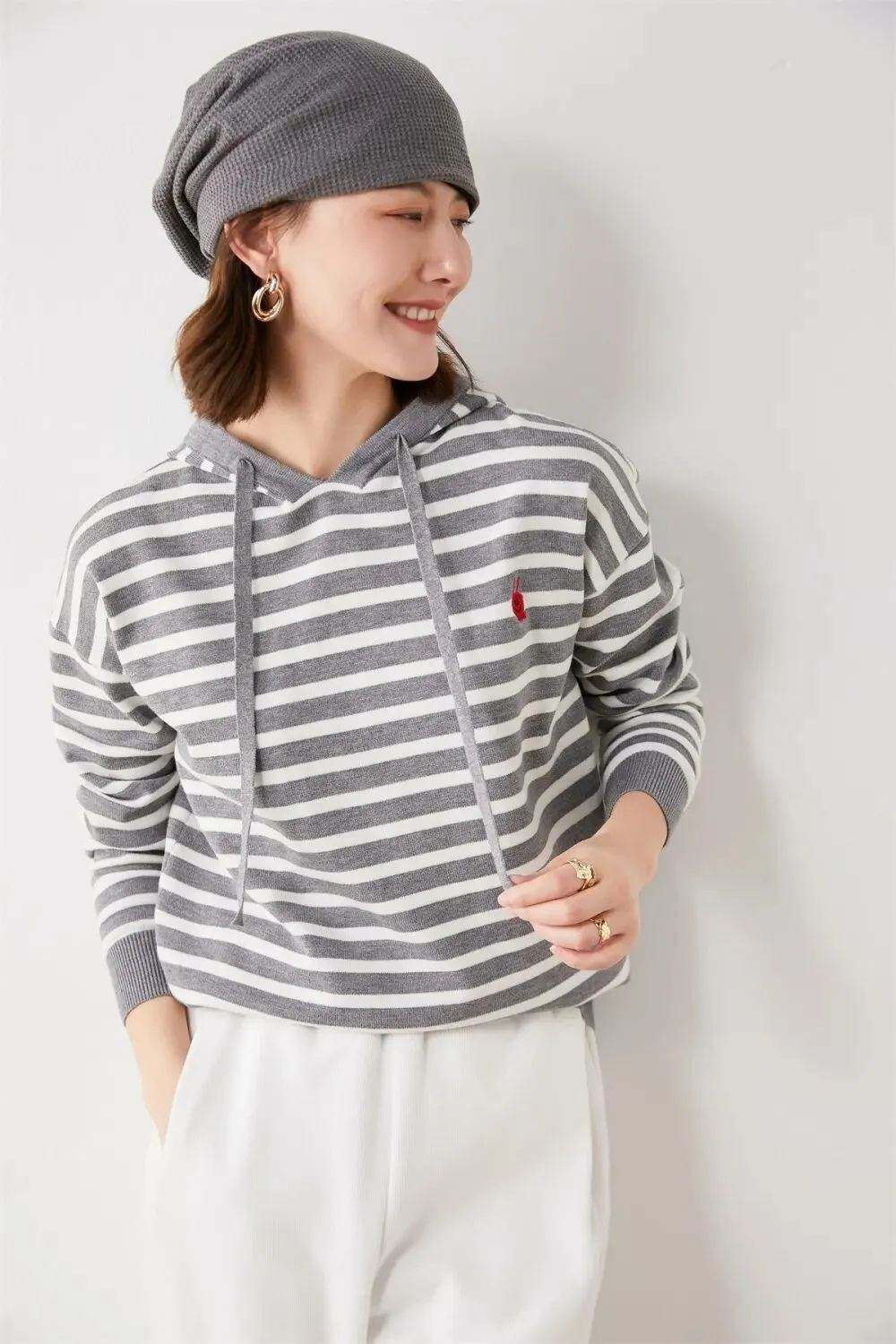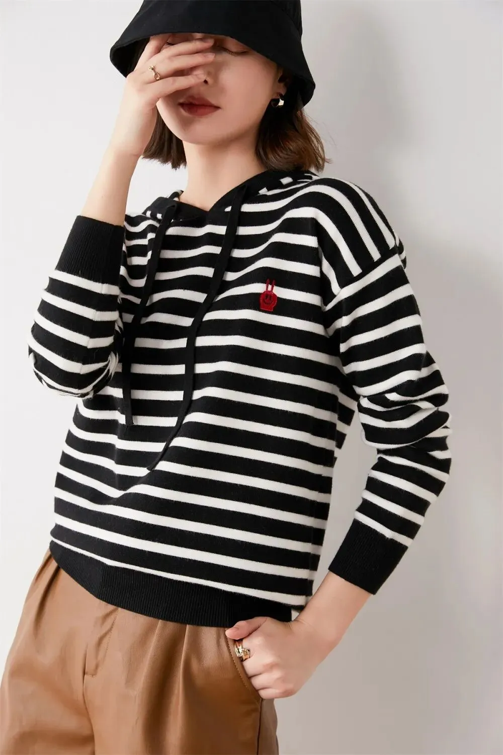 这一款针织面料的“秋季条纹套头连帽衫”,我一定双手推荐,单穿、内搭都很好看的那种。
