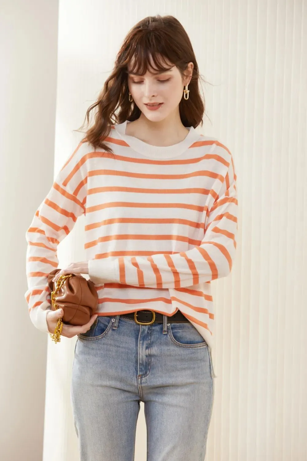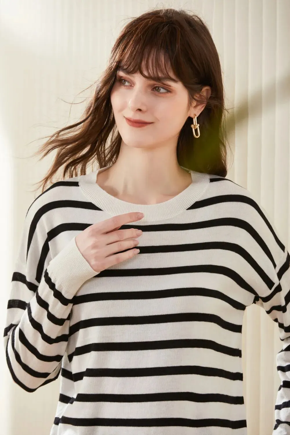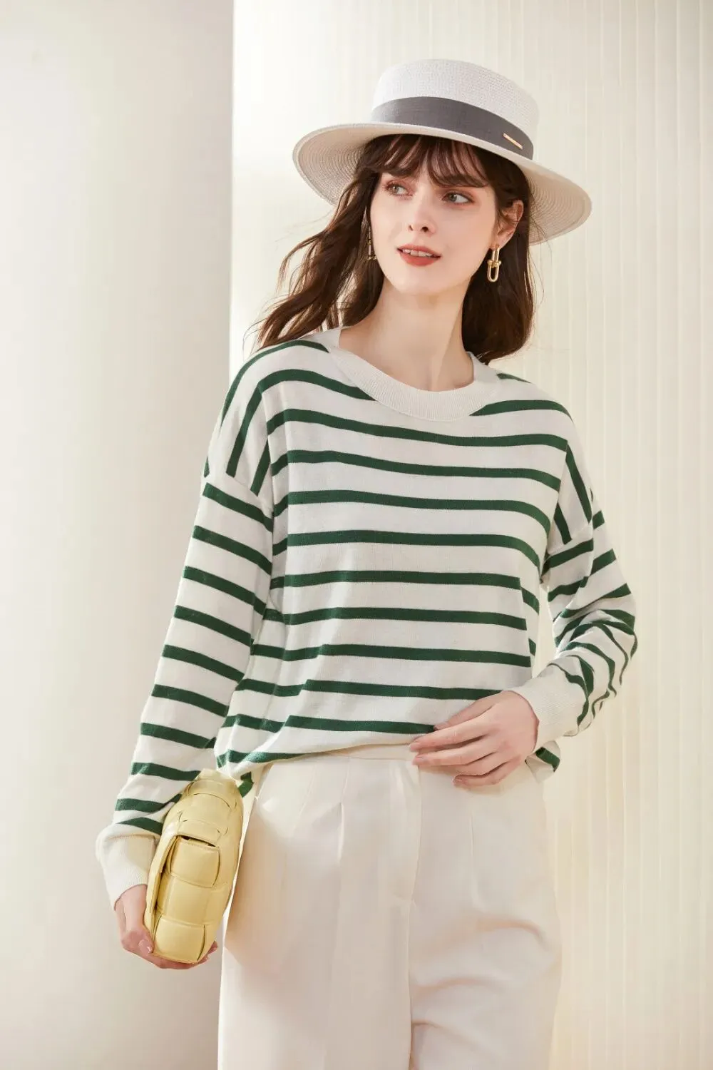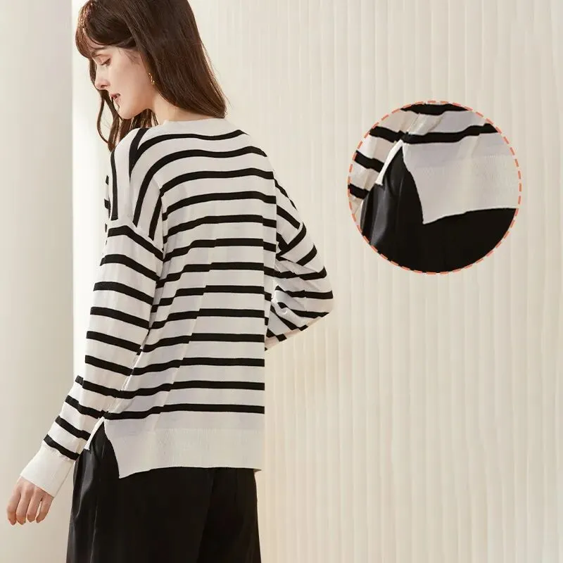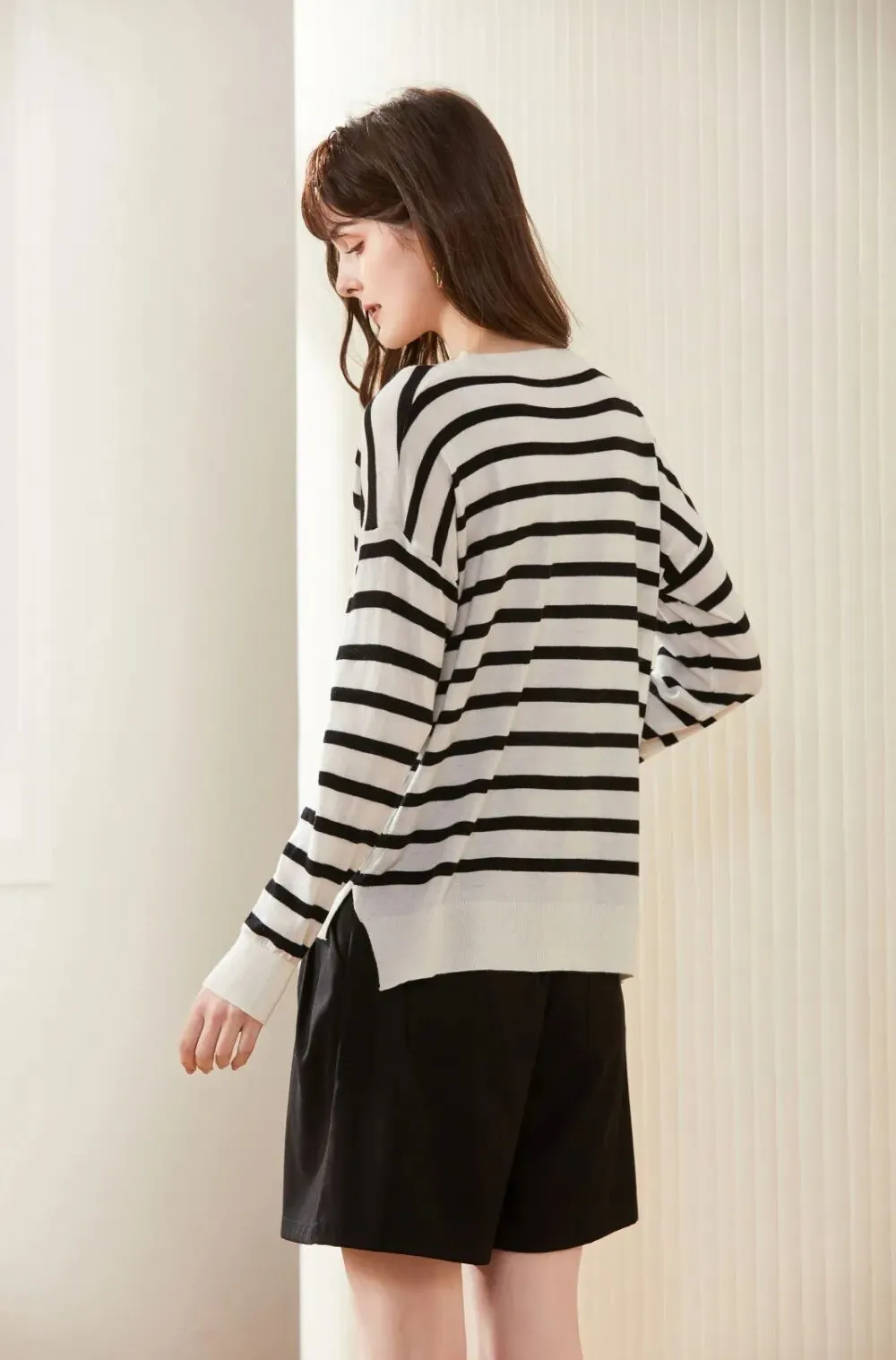 韩版时尚宽松版型的针织衫是藏肉遮肉的“好手”,适合各种身材,条纹线条流畅,色泽柔和,质感出众。