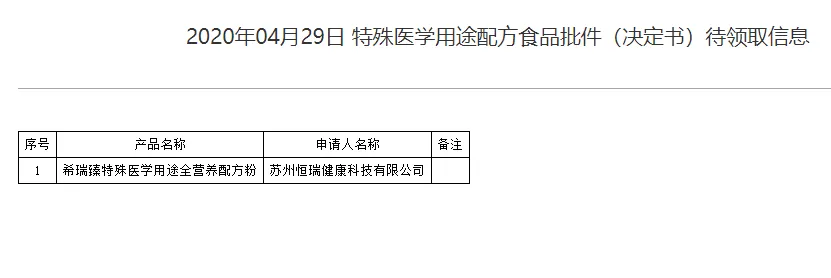 4月29日,国家药品监督管理局发布了1款特殊医学用途配方食品批件(决定书)待领取信息,申请人名称显示为苏州恒瑞健康科技有限公司,详情如下:(国家药品监督管理局)