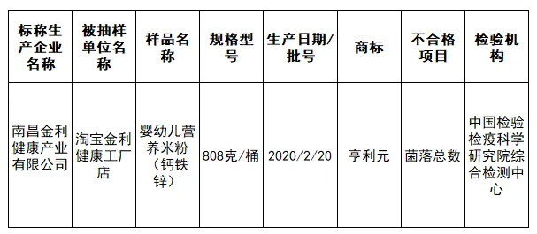 4月30日,市场监管总局发布《关于9批次食品不合格情况的通告〔2020年 第8号〕》。据通告,淘宝金利健康工厂店(经营者为江西省南昌金利健康产业有限公司)在淘宝网(网店)销售的、标称江西省南昌金利健康产业有限公司生产的婴幼儿营养米粉(钙铁锌),被检出菌落总数不符合食品安全国家标准规定。检验机构为中国检验检疫科学研究院综合检测中心。对抽检中发现的不合格食品,市场监管总局已责成相关省级市场监管部门立即组织开展核查处置,查清产品流向,采取下架召回不合格产品等措施控制风险;对违法违规行为,依法从严处理;及时将企业采取的风险防控措施和核查处置情况向社会公开,并向总局报告。特殊膳食食品监督抽检不合格产品信息如下:(市场监督管理总局)