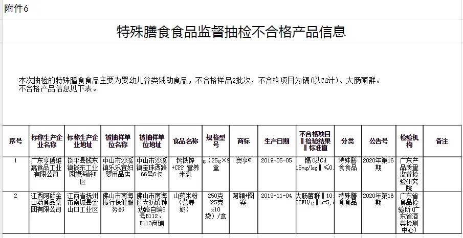 广东省婴幼儿谷类辅食品2批次抽检不合格