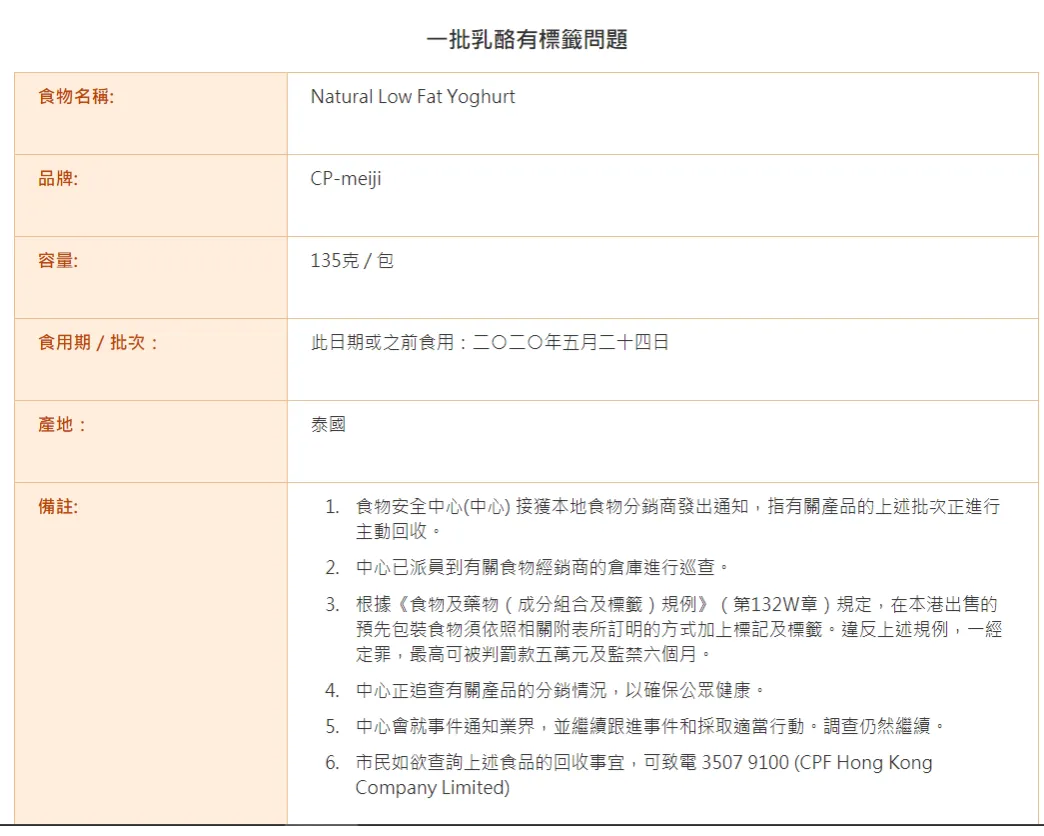 5月7日,香港特别行政区政府食物安全中心消息显示,CP-meiji一批奶酪有标签问题,详情如下:(香港特别行政区政府食物安全中心)