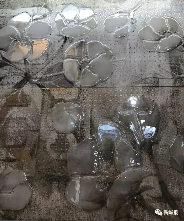 制作工艺为化妆釉上面加3D浮雕墨水,施面釉,再喷墨印刷,最后施保护釉。