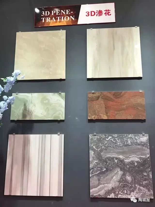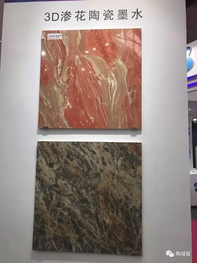 上一届工业展3D渗花墨水是绝对主角,今年渗花产品应用更加成熟。渗花墨水打印后在砖面具有垂直渗透的能力,抛光后的陶瓷砖亦能充分展现出鲜艳色彩、立体纹理。