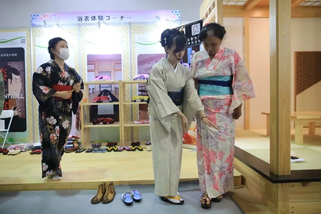 可爱的熊本熊周边、美丽的日本浴服、科技感十足的体适能游戏......除了各类日本商品外,此次展会还正式搭建了日本文化旅游资源专区,吸引了日本新潟、宫城、神奈川、广岛、和歌山、富山、北海道、岩手、鸟取、熊本、山口、群马、琦玉、爱媛、舞鹤市、北九州市,共计16个地方政府代表前来参展。现场除了发放日本各地的旅游指南册、播放旅游风光视频外,还专门搭建了日本和室场景,为大连市民提供和服体验。