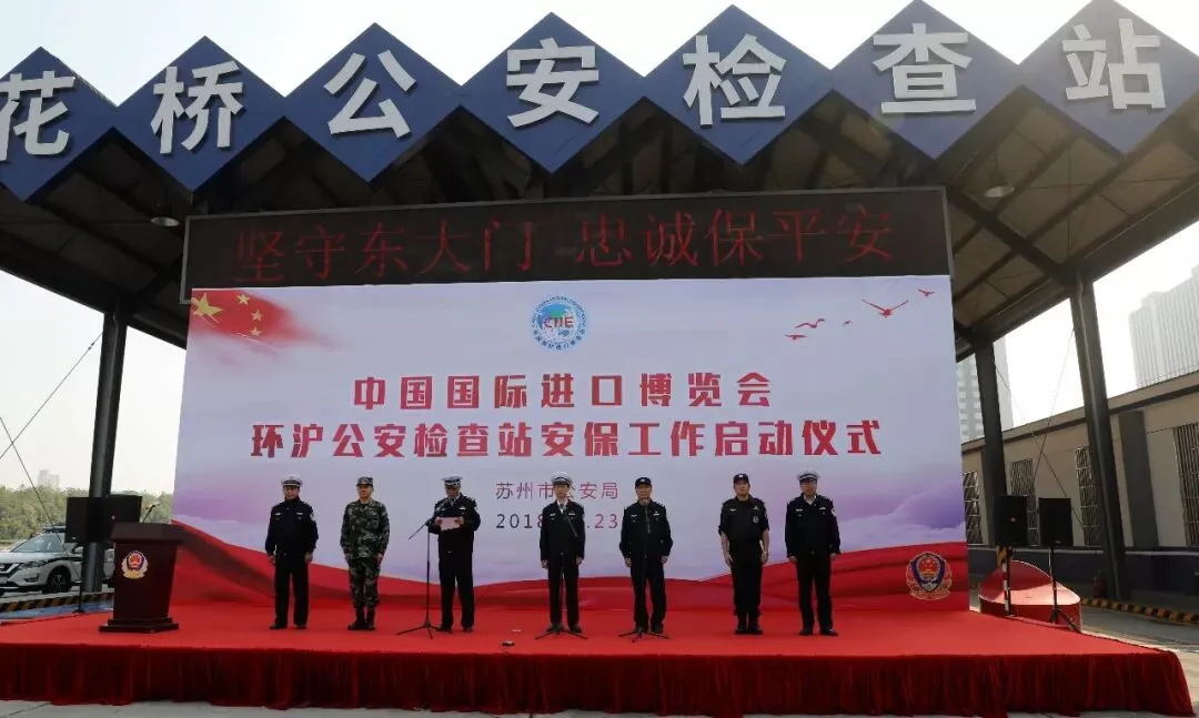 苏州与上海相邻,“护城河”、“安保圈”安保任务十分繁重,特别是入沪的各公路公安检查站承担着十分重要的“滤网”、“屏障”作用。为切实强化公路公安检查站进博会安保工作的组织动员,凝聚全体参战人员的战斗合力,2018年10月23日上午,苏州市公安局在G2京沪高速花桥公安检查站举行了中国国际进口博览会环沪公安检查站安保工作启动仪式。