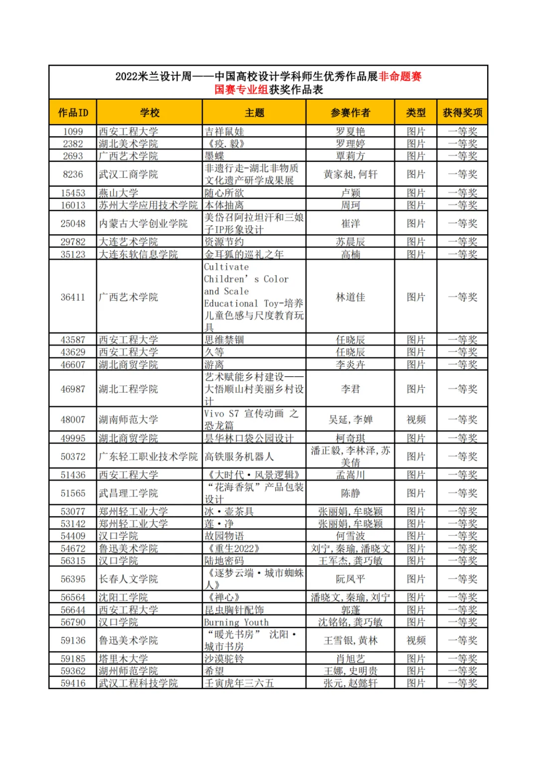 第六届“米兰设计周——中国高校设计学科师生优秀作品展”国赛评审工作已全部结束,本届作品展国赛评审工作由米兰设计周高校设计展组委会承办并组织国内权威专家进行线上评审,根据赛程赛制分别评选一二三等奖,现将非命题赛道国赛专业组获奖结果(不含论文)予以公示: