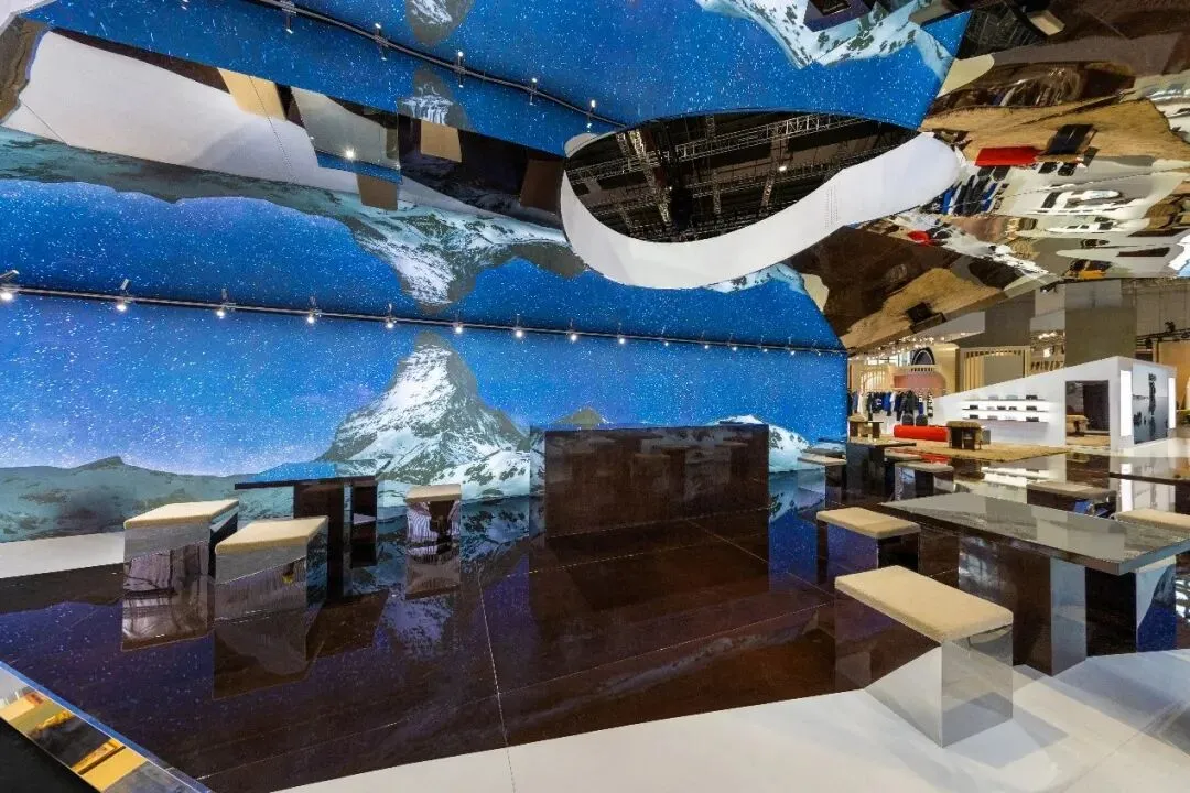 专为本次进博会精心设计和打造的博柏利展台别具一格,让人联想到绵延山脉中舒适的山巅雪屋。在高山雪地为主题的冰雪世界中,观众可以身临其境,开启户外探险之旅。展台外立面仿佛覆盖着积雪,其柔和的线条映照着博柏利全新外套系列的绗缝轮廓,并点缀有标志性 TB 印花,致敬品牌创始人的开拓精神。展台内布置有雪山缆车,缆线伸向未知的远方,礼赞无畏探索中的机遇和喜悦。