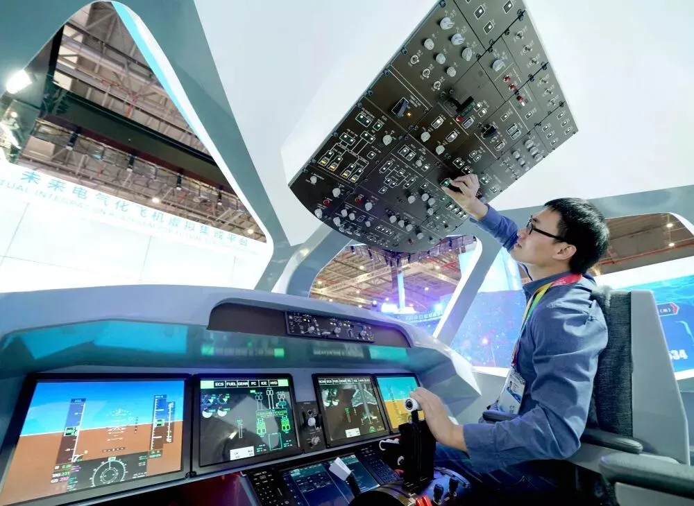 11月5日,工作人员在第二届进博会中国馆调试未来电气化飞机虚拟集成平台。新华社记者 陈建力 摄