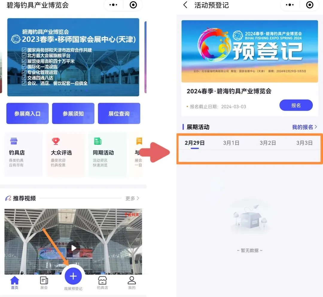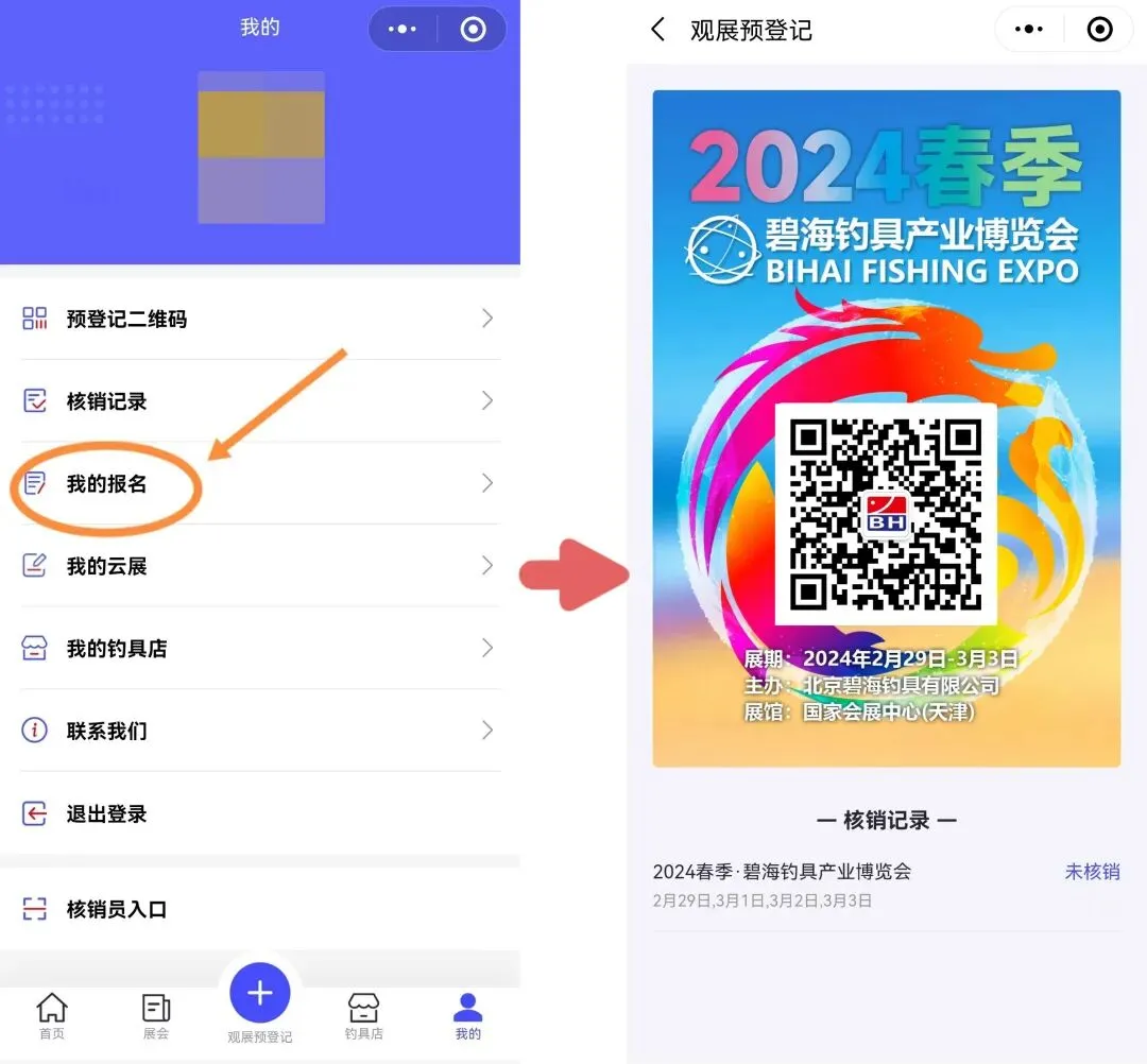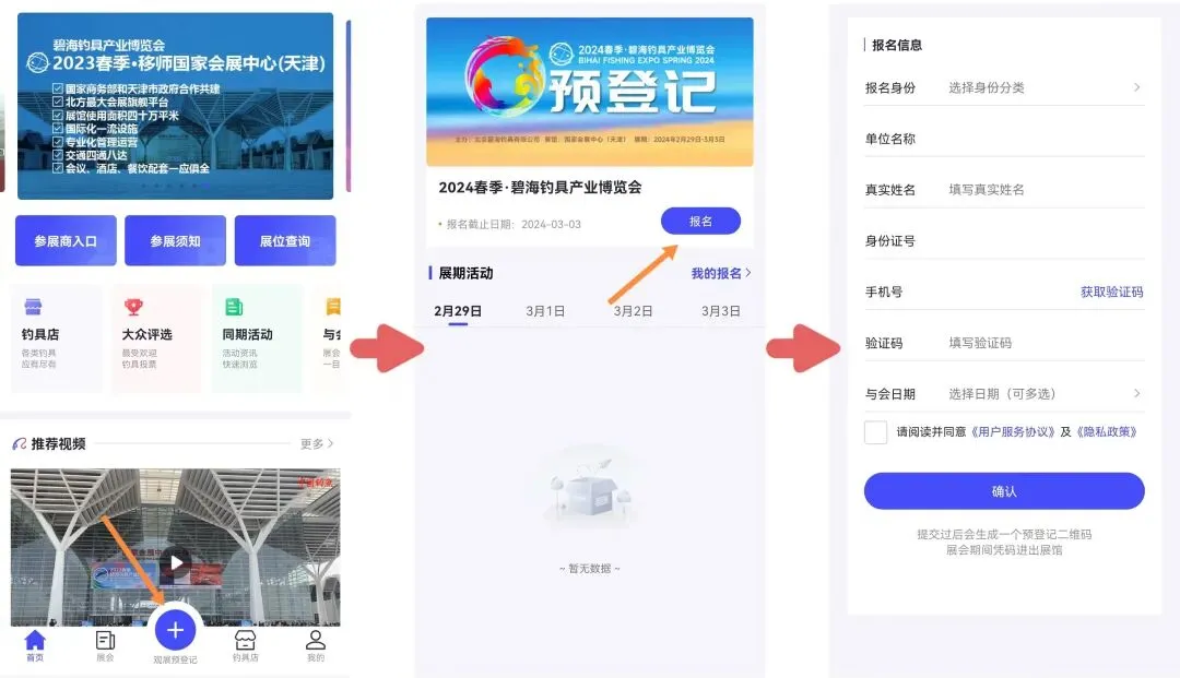 第3步:点击首页下方【观展预登记】,点击“2024春季·碧海钓具产业博览会”右侧【报名】按钮,填写观展信息,展会日期可以多选。填写完点击“确认”,即可生成预登记二维码。