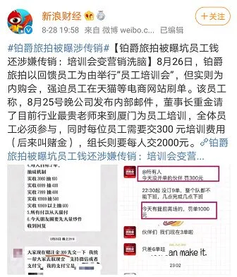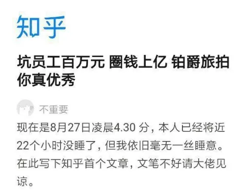 8月27日晚,有网友在知乎、微博等社交平台发表文章《坑员工百万元 圈钱上亿 铂爵旅拍你真优秀》一下子便引发大家的关注。