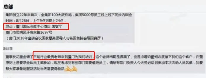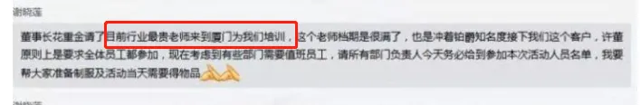 爆料人称自己接到总部通知,公司老总请了目前行业最贵的老师为他们做培训。