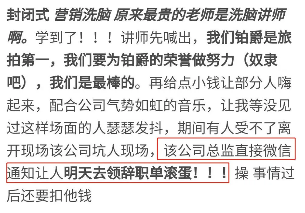 原来,一位自称铂爵旅拍员工的网友发布文章控诉铂爵旅拍对员工封闭式洗脑营销,还爆出了大家不为人知的惊天内幕……