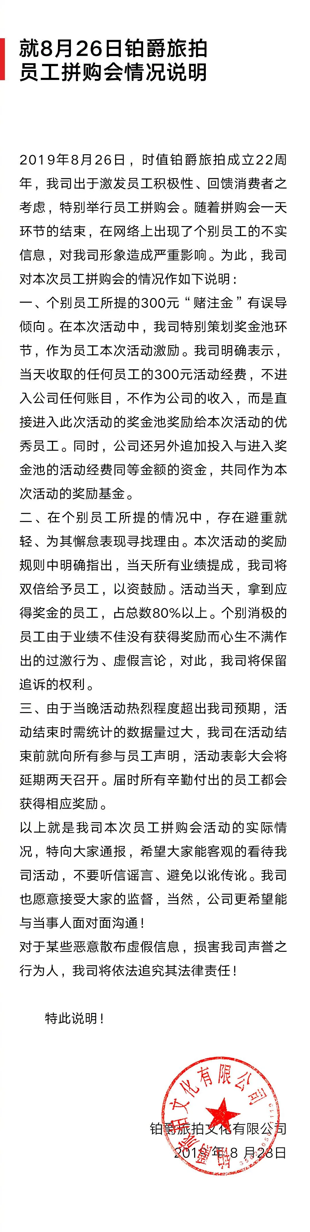 昨天下午5点,铂爵旅拍微博针对员工拼购会情况进行说明。主要内容可概括以下三点: