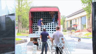 货运车停放在门口,工作人员忙着装卸