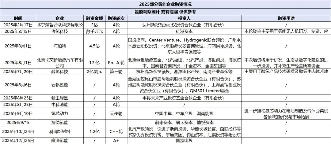 2025年,氢能企业融资环境持续优化,融资资源向头部企业与核心技术领域集中,氢能观察本次统计12家2025年融资企业,业务领域覆盖氢能两轮车、车辆制造、电解槽、燃料电池等,多个企业完成亿元融资,具体如下: