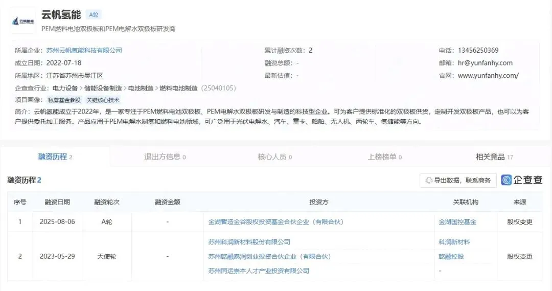 2025年3月,海珀特成功完成4.5亿元A轮融资。本轮融资由国投招商、Center Venture、Hydrogenic联合领投,广州水木氢云股权投资、北京顺源长芯咨询管理、海南易德投资、北京太极华青佩诚等多家投资机构参与投资。