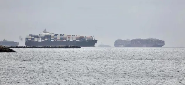 ▲2021年10月22日拍摄的在美国加利福尼亚州洛杉矶附近海域等待卸货的集装箱货轮