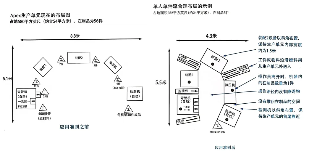 当加热、冷却、表面处理等工序,是通过传送带形式加工生产时,可以保留在连续流的内部,只要操作员能够在节拍内完成装料和卸料就可以了。不过需要注意一点,要注意消除不必要的走动浪费。