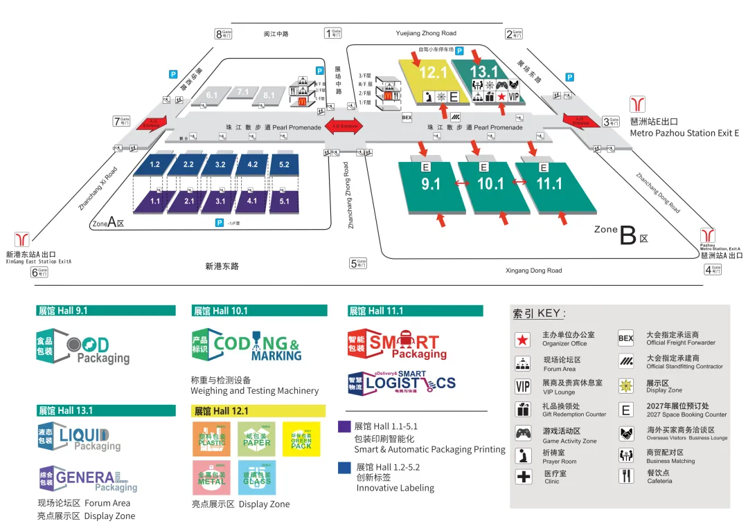 地铁8号线/11号线琶洲站(离B区最近,包装工业展、包装材料与制品展)下车,或8号线新港东路站(离A区最近,标签展和印刷展)下车,步行最多三分钟即可到达展馆。请根据文章上半部分的“展馆布局”和自己的参观计划,自行决定下车站。