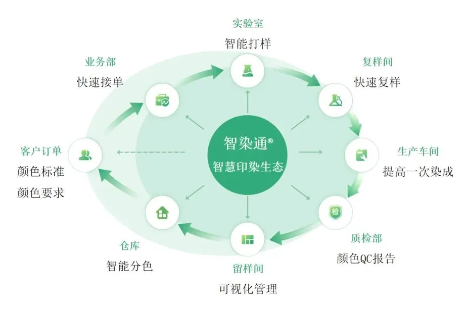 连接颜色生产的每一个环节。智染通®以数字化技术将生产各个环节的信息打通,建立工厂智能高效快返的机制,加强各部门间的协同生产管理能力,这样可以在很大程度上减少各环节间的响应阻力,进而提升印染企业生产效率、经营能力和快反能力。
