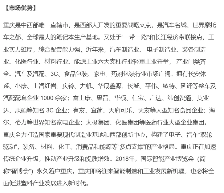 ★ 观众邀请行业:参观企业以汽摩制造厂、汽摩零配件、电子产品、家用电器、航空航天、军工、塑料包装及容器、包装印刷、医疗、塑胶管道为主,另邀请食品、饮料、日用品、体育用品、玩具、礼品、服饰、工程配件、建筑材料、模具及零部件加工等行业,还邀请各大专院校、化工科研单位、相关行业协会、新闻媒体、投资贸易机构人士参观。