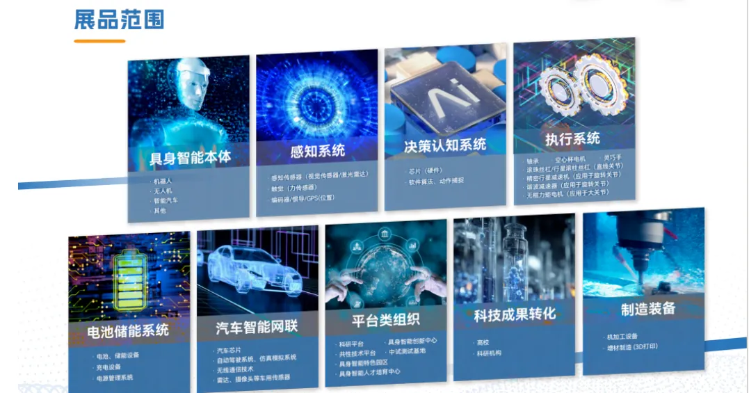 :覆盖九大核心领域,包括具身本体(机器人、无人机、智能汽车)、感知系统、决策算法 / 芯片、执行部件、电池储能、汽车智能网联、成果转化平台等。 - 同期活动