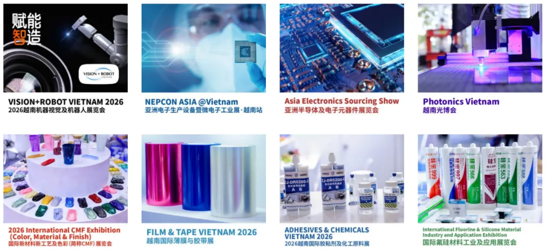 届时,展会将通过整合“亚洲电子生产设备暨微电子工业展 · 越南站”、“越南国际薄膜与胶带展”、“越南国际粘胶剂及化工原料展” 、 “越南机器视觉及机器人展览会”、“亚洲半导体及电子元器件展览会”、“越南光博会”、 “国际氟硅材料工业及应用展览会” 及 “国际新材料工艺及色彩(简称CMF)展览会”八大主题展,形成一个集成化的展示IP,全面覆盖半导体与元器件、表面贴装技术(SMT)、智能工厂、新材料及机器视觉技术等产业链关键环节,旨在为越南市场系统性地引入经过检验的先进工业制造技术与解决方案。