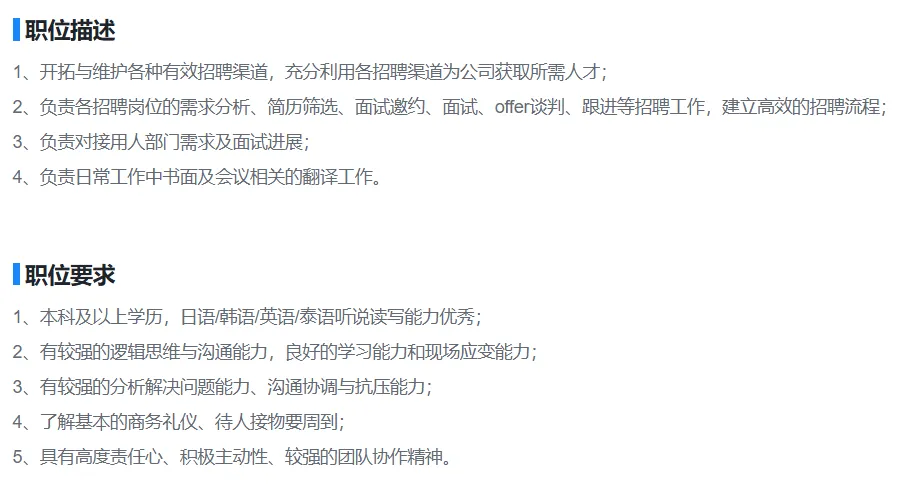 需求语种:日语、韩语(朝鲜语)、英语(商务英语)、泰语