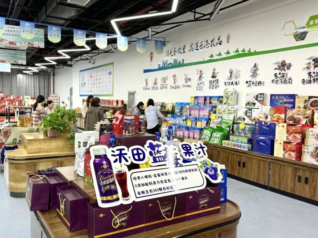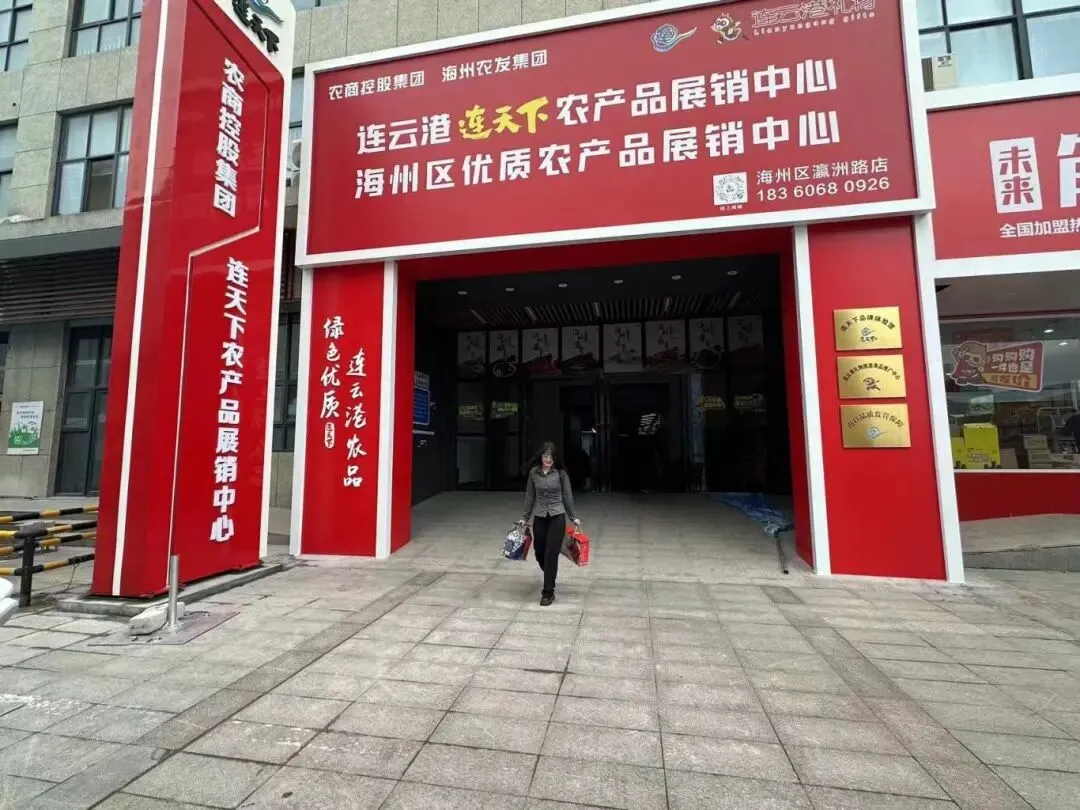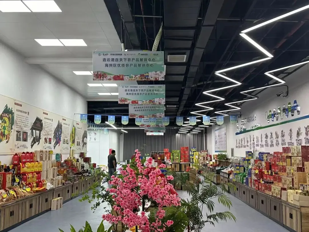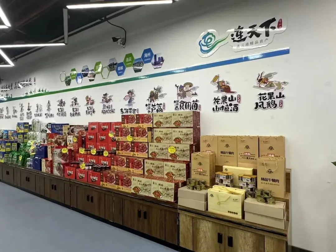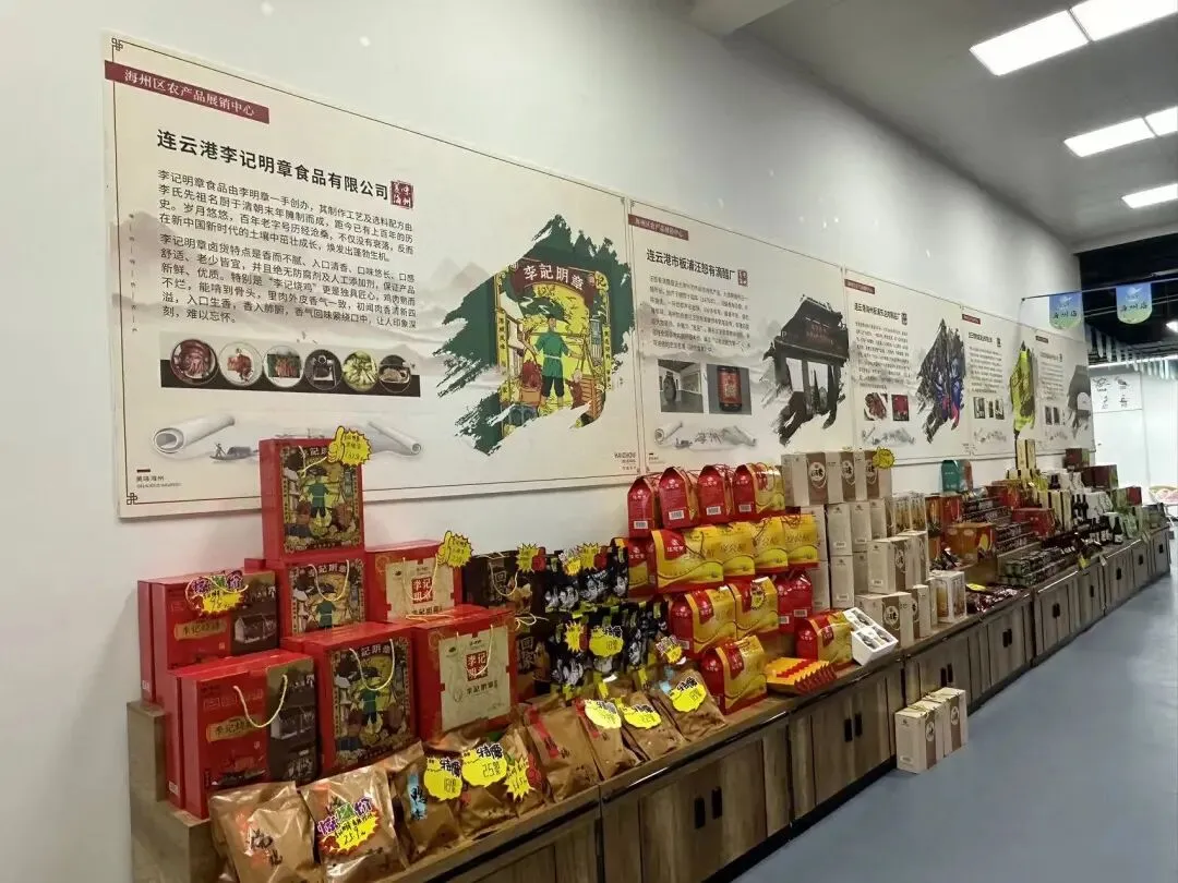 向展销中心内部走去,里面摆满了连云港的各种农产品,工作人员正有条不紊地进行农产品摆放、归整工作。“农贸市场1号楼的一楼全是我们‘连天下’农产品的展销中心,有3000多平方米,这里将摆满来自连云港各个县区的百余个品牌、上千种商品。”店铺工作人员浦云一边将一箱板浦香肠拎到货架上一边向笔者介绍。