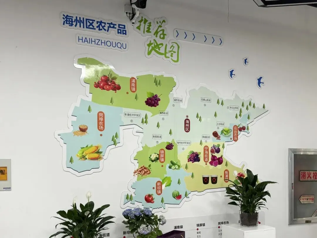 一旁的墙壁上,张贴着一张海州区农产品推荐地图,用不同的颜色将不同的乡镇、街道区分开,并标注上农产品的图示,生动形象、一目了然,方便企业和消费者更好地了解“连天下”农产品。