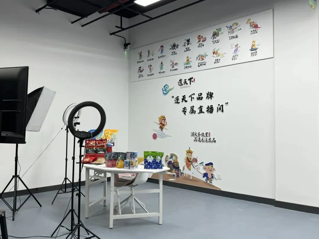 在展销中心的一隅,有一个装备齐全的“连天下品牌专属直播间”,桌子上摆满了各式各样的港城农产品,届时将“线上”“线下”齐发力,让“连天下”品牌的名声更大、“连天下”农产品的销路更广。