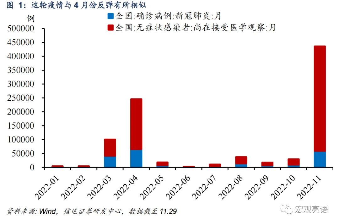 1)从疫情形势上看,4月疫情集中,11月疫情分布更广、涉及范围更大。11月国内疫情形势严峻,出现多点开花局面。截至11月29日,11月新增确诊和无症状感染者的数量飙升,与今年4月份的疫情形势略有相似。但与4月相比,11月的新增确诊数量约5.9万例,比4月份的6.5万例要少一些。而11月份的疫情主要以无症状感染者为主,且分布更广、范围更大。